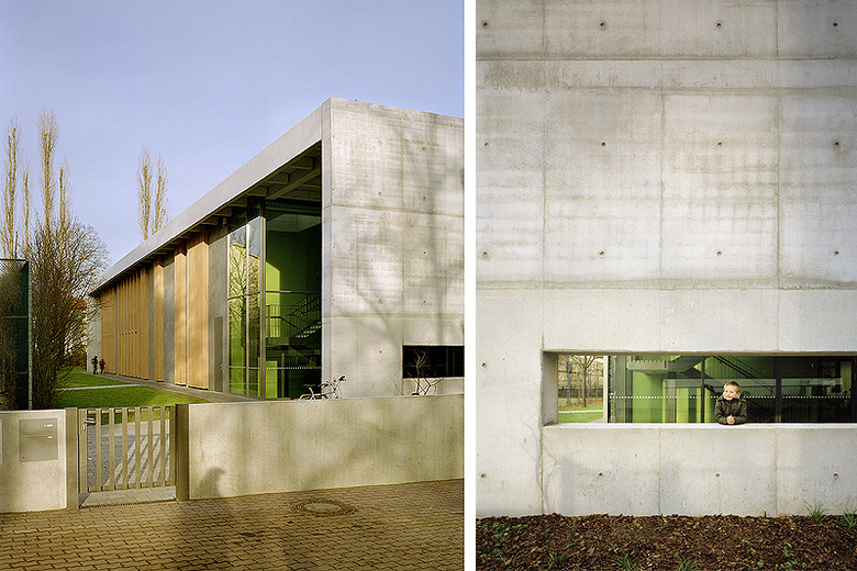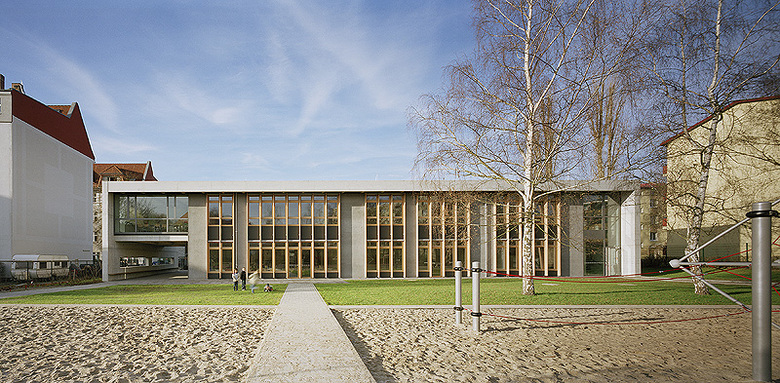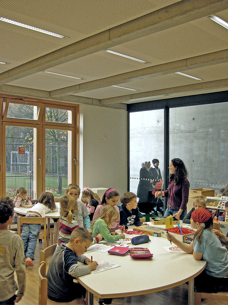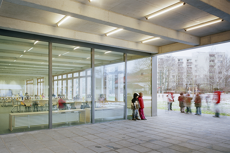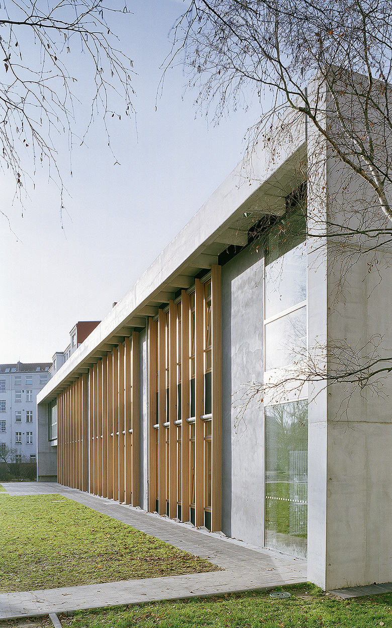 Unter einem festen schützenden Dach aus Sichtbeton bietet der Neubau viel Raum für die Erweiterung der Birken-Grundschule und der Schule am Grüngürtel zu offenen Ganztagsschulen mit 155 Plätzen. Das zweigeschossige Gebäude im Berliner Stadtbezirk Spandau (Gesamtbaukosten etwa 2,2 Mio €) wurde aus Mitteln des Programms „Zukunft Bildung und Betreuung“ IZBB und des „Europäischen Fonds für regionale Entwicklung EFRE finanziert. In die Straßenflucht einer Gründerzeitfassade platziert, vermittelt der Baukörper zwischen der Blockrandbebauung im Süden und einer offenen Bebauungsstruktur mit 4-geschossigen Wohnhäusern aus den 50-iger Jahren im Norden. Im Rahmen der Maßnahme wurden auch die weitläufigen Sport- und Erholungsflächen im Inneren des heterogenen städtischen Großblocks neu geordnet.