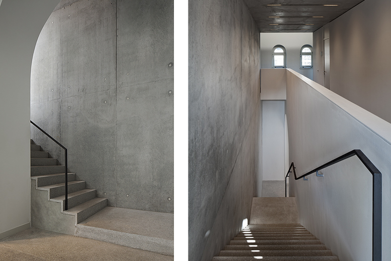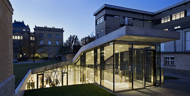 Die Glasfassade mit flächenbündigen Pressleisten und die Stützenverkleidung mit polierten V2A Paneelen unterstützen die Dynamik des Gebäudes. Deckenuntersicht und Außenwände sind in monolithischer Sichtbetonqualität. Zum Erhalt des Raumzusammenhangs wurden alle Systemtrennwände mit Oberlichtern ausgestattet, der Boden besteht aus flächigem Terrazzo mit Marmorsplitt. Weiße mikroperforierte Akustikpaneele an den Wänden bieten Schallschutz. Labor- und Verkehrsflächen sind mit modernsten LED-Leuchten ausgestattet.
