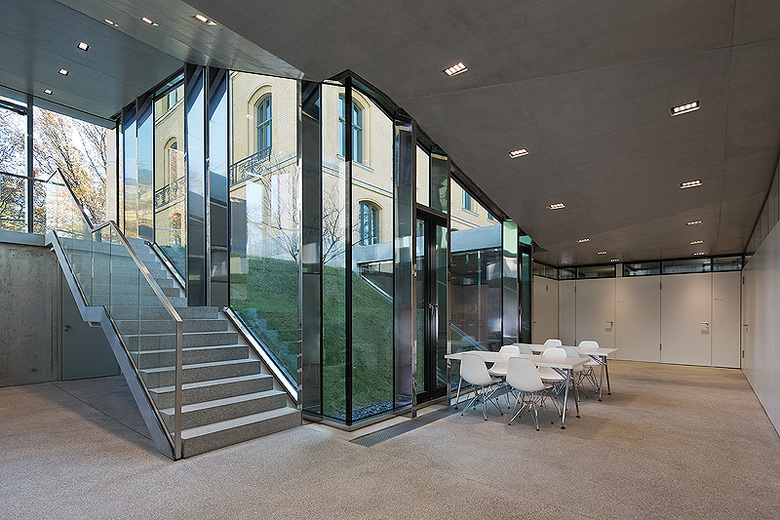 Die Blicke öffnen sich über den geneigten Innenhof zum Observatorium und in die Bäume des „physikalischen Parks“.