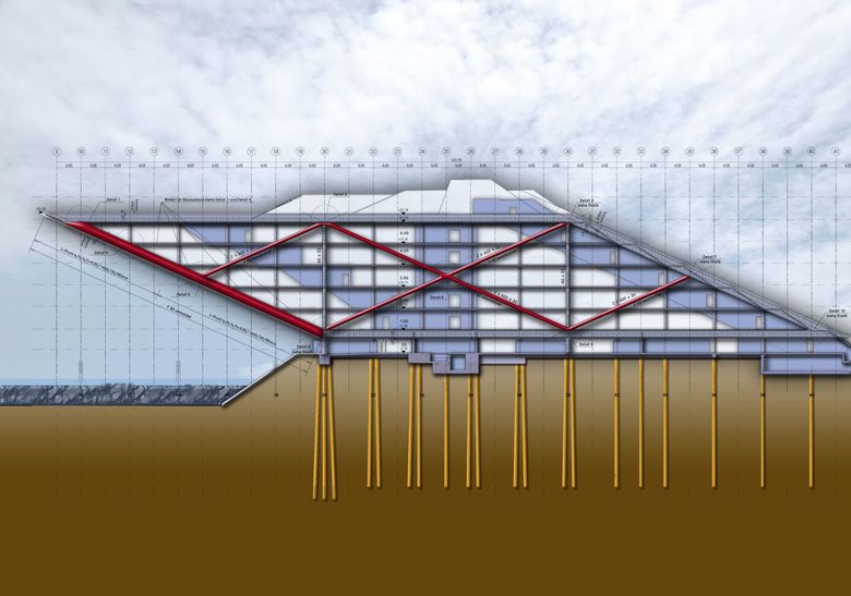 Vier gebäudehohe Stahlfachwerkrahmen realisieren die große Auskragung und die Längsaussteifung des Gebäudes, das sicher auf Pfählen gegründet ist.