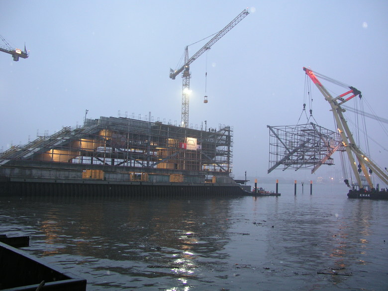 Bauen in der Elbe. 400 m Spundwand wurden eingebaut und 30.000 m³ Erde bewegt, um neuen Baugrund zu schaffen für das eindrucksvolle Gebäude mit dem bezeichnenden Namen. Das “Dockland” erstrahlt hier als Perle in der Gebäudekette am nördlichen Elbufer. Besucher können - entweder zu Fuß über die Treppenanlage oder auch bequem durch zwei Schrägaufzüge befördert - auf einer Plattform 35 m über der Elbe ein Ozeandampfer-Feeling erleben. Die äußerste, weit in die Elbe reichende westliche Spitze ist jedoch nur den Mietern zugänglich.