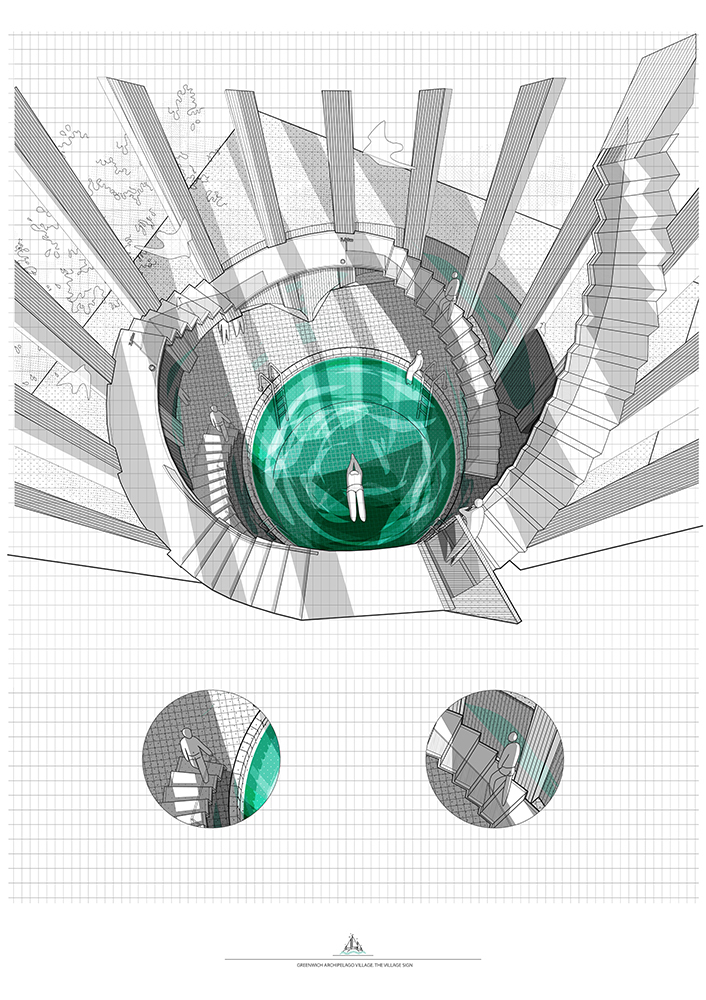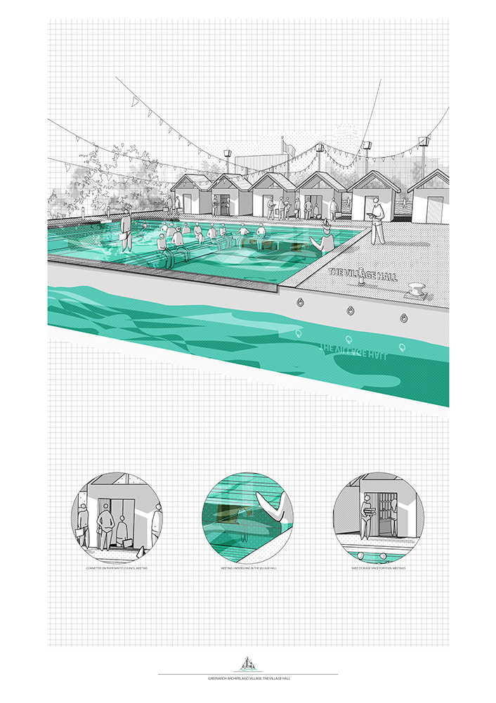 GAV is a watery place populated by amphibian villagers whose lives revolve around water and its joys; the villagers’ love for water is what tightens their community, drives their everyday choices and shapes their world. For the Greenwich Millennium Village site this system also aimed at solving certain issues like accessibility to central London and uneven usage spread across the village’s territory due to a lack of village attractions. In its proposed form GAV enables the villagers themselves to be the village attractions, the neighbour from the vis-à-vis block doing his job as water trainer or hydrodynamics scientist testing prototypes being a most exciting thing to watch and reason enough to travel across the entire village without stranding one side and overpopulation another. Essentially GAV is a self perpetuating amphibian lifestyle enabled by a form-follows-function environment with Venetian reminiscences.