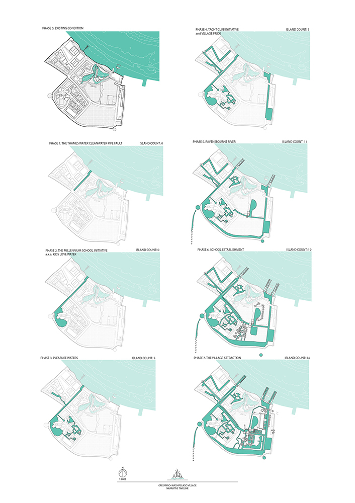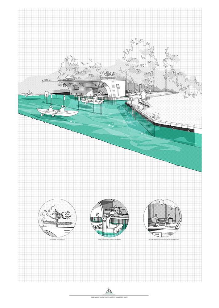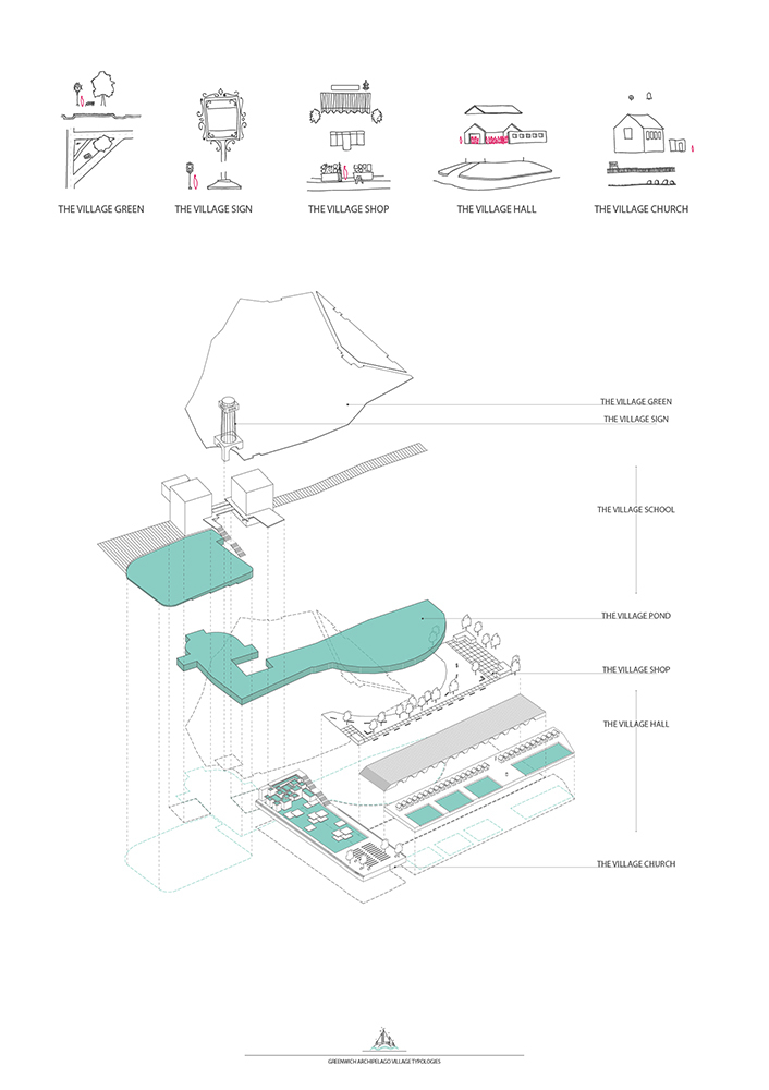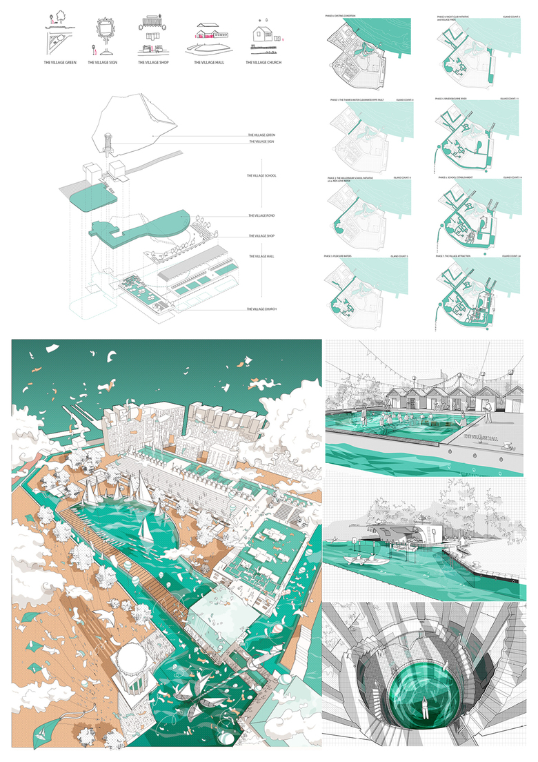 The project illustrates the slow, organic, spread-over-generations process an urban village would potentially go through in its way to becoming a meaningful village. The strategy consisted of taking the element the village already had and that the locals love, its proximity to the river Thames with its ships, masts and flying seagulls, and amplify it. This gives the village the niche that has been identified as a common denominator for all quintessential English villages (see fishing villages, mining villages, the cleanest village of…, etc.).