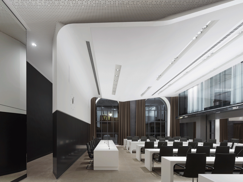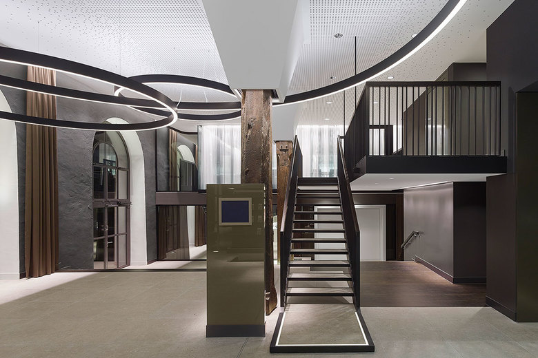 Vom Foyer mit seinen historischen Holzsäulen führt eine Treppe hinauf in den Trausaal. Dessen schwebender Einbau und die darunterliegende Front zum Plenarsaal sind aus Glas, sodass der Raum als Ganzes erfassbar bleibt. Den Plenarsaal prägen das geschwungene Deckensegel und die auf Sichtkontakt optimierte Sitzanordnung, die eine konstruktive Kommunikationsatmosphäre fördert.