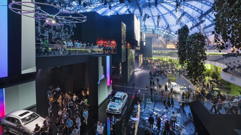 Die Ausstellungsarchitektur von jangled nerves zieht einen Gebäuderiegel quer in die Festhalle. Er beherbergt auf über 5000 m2 eine hochmoderne Ausstellung, die »Experience«. Die kreative Idee dahinter war, mit dem altehrwürdigen Gebäude anders umzugehen, als in den Jahren zuvor. Das schafft mehr Bezug zur Halle und zur Stadt und vermittelt die zukünftige Beziehung Mensch-Automobil möglichst authentisch.