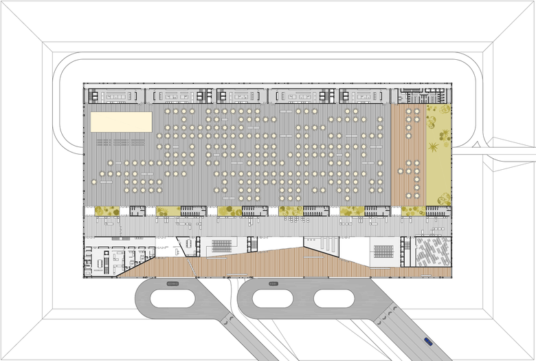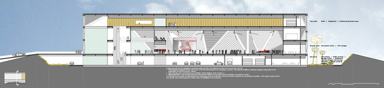 EL INTERIOR – Tras la piel, existen dos ‘avenidas’ peatonales, una exterior y otra interior. Separadas por una barra de programa que acoge los accesos y distribuye a los visitantes hacia los diferentes lugares. La zona dedicada a las bodas y/o convenciones, se divide en seis sub-espacios, cinco interiores y una terraza, que a solicitación del/los usuarios pueden articularse entre si. Finalizando el edificio por la cara opuesta del acceso público, hemos proyectado una barra de servicios, que alimenta cualquier necesidad desde la planta -1 hasta la cuebierta donde se encuentra el hotel, y el restaurante. El interior se adapta a cualquier solicitación del cliente. El programa funcional es variable a la vez que el edificio se adapta a requerimientos acústicos y/o visuales. Con el fin de ofrecer opciones de uso que van desde las bodas a espectáculos musicales, deportivos, políticos… Todo el edifico esta elevado con el fin de solucionar dos problemas; la vision de cientos de vehículos frente al edificio y la protección térmica de los mismos. En Oriente medio es fácil observar como la gente deja los coches en marcha mientras realizan ‘recados’, con el propósito de que no se caliente, y en numerosas ocasiones porque el chofer espera dentro a al propietario/a.