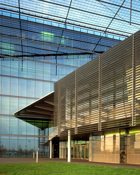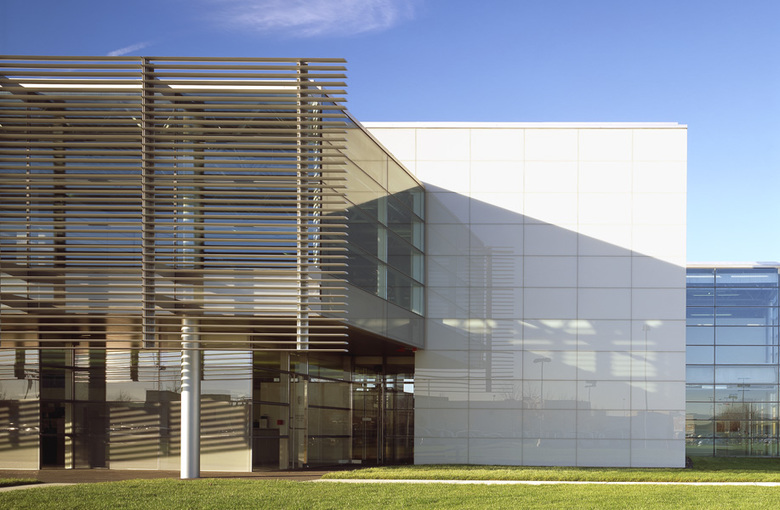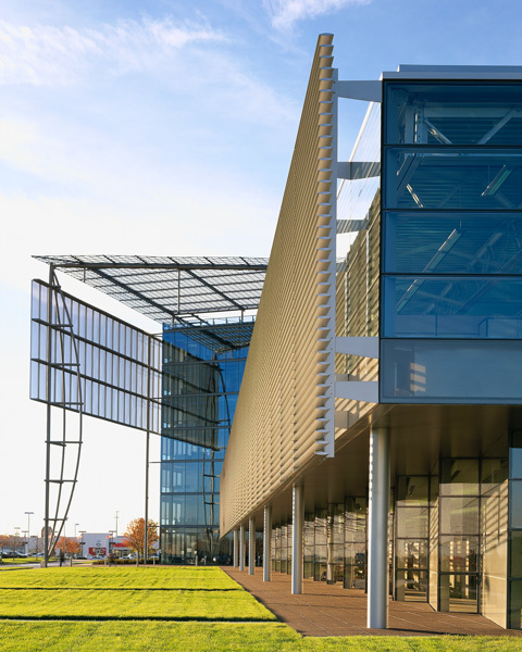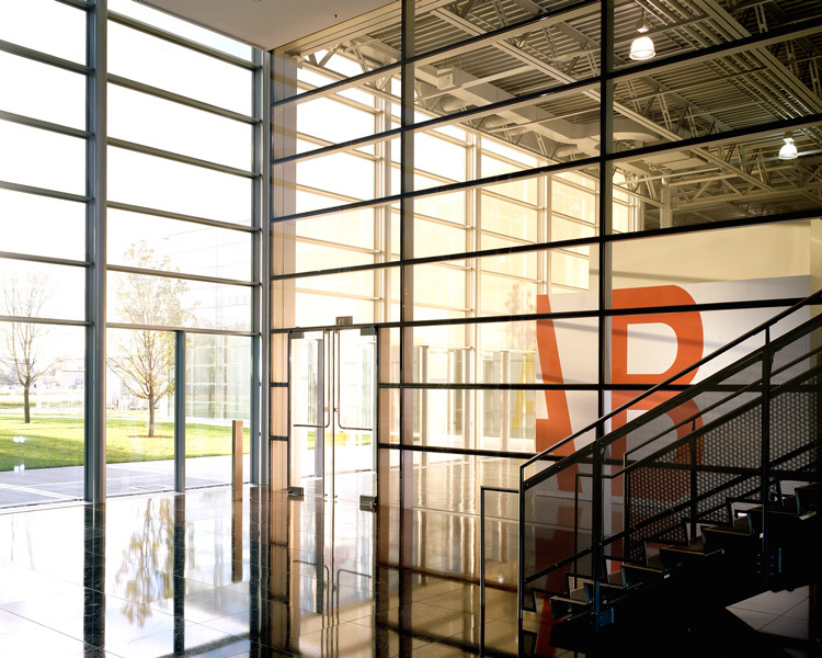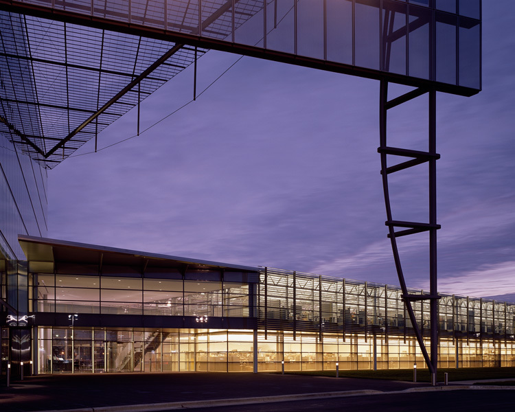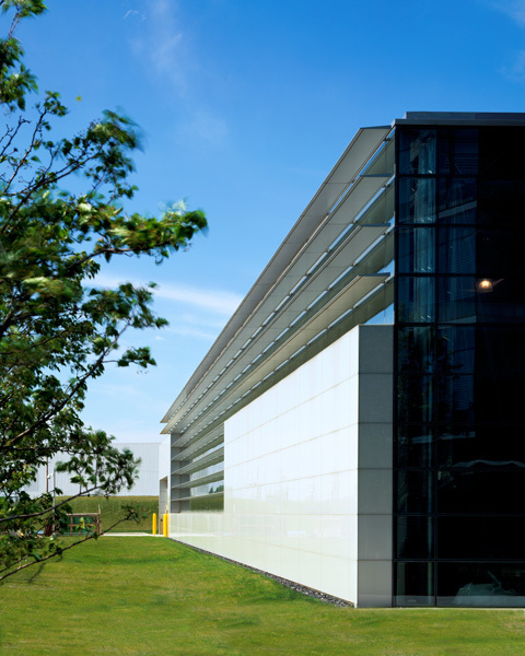 The solution is a high-bay long span steel frame building, clad in glass and steel panels. Natural light is controlled by use of fixed louvers. Testing laboratories and other technically autonomous spaces are given tighter control of light, air quality and acoustic isolation inside enclosed pavilions on the main floor. Staff areas occupy a glazed mezzanine overlooking the testing floor. This integration of engineering and office staff within one building promotes better communication and efficiency between these historically separate groups of professionals.