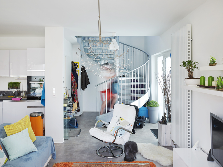 Im Erdgeschoss sind Küchen- und Wohnräume angeordnet. Zu den nach Südwesten angrenzenden Gärten liegen jeweils eine Außenterrasse und ein Wintergarten. Der über zwei Geschosse reichende Pufferraum kann in der Übergangszeit dem Wohnraum zugeschlagen werden. Die Wintergärten sorgen nicht nur für räumlichen Gewinn, sondern lassen in der kalten Jahreszeit den Luftwechsel mit vortemperierter Außenluft zu. Alle Räume im Erd- wie im Obergeschoss verfügen jeweils über ein Fenster in den Wintergarten und direkt in den Garten. Die Bewohner können so individuell entscheiden, ob sie über den thermischen Wintergarten oder direkt von außen lüften.