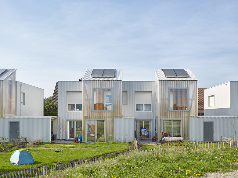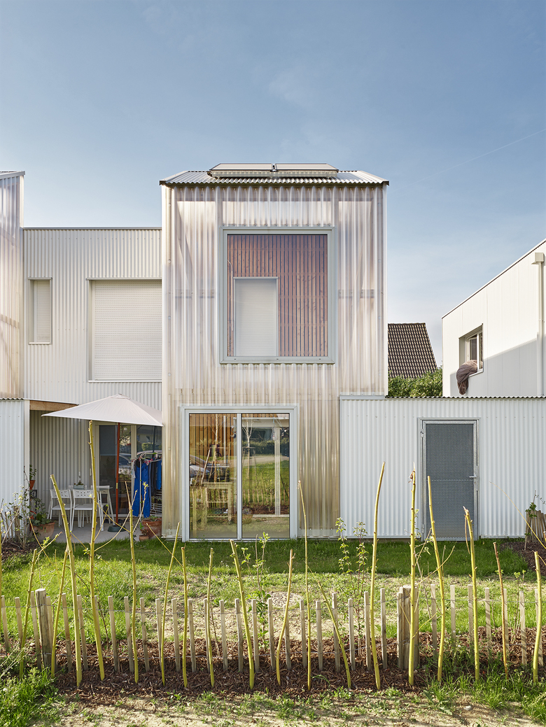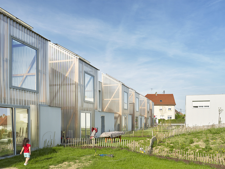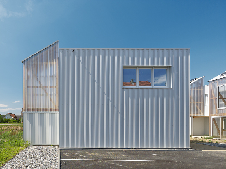 elsässische Bauweise, Fachwerk und Erker, und bindet die Häusergruppe in den Ortskontext ein. Der ephemeren Hülle der Wintergärten aus eine gewellten Doppelsteg-Acrylplatte hat das Ensemble den liebevollen Spitznamen ‚Pierre de lune’ zu verdanken.