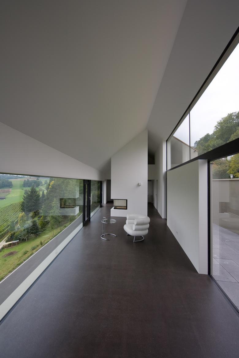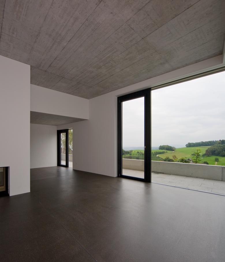 Der architektonische Entwurf der beiden Hausteile nimmt die einzigartige Panoramalage sowie den historischen Bezug zum Burgstädtchen Regensberg auf und übersetzt diese Qualitäten in eine zeitgemässe Formsprache. Jeweils drei Wohnungen pro Haus zeichnen sich durch individuelle Grundrisse, Höhenstaffelungen und Proportionen aus, wobei das Wohnzimmer als zentrales Element mit einer Raumhöhe von 3,4 Metern und raumhohen Verglasungen nach Süden beeindruckt. Ein spannungsvolles Wechselspiel entsteht durch die Kontraste zwischen den verwinkelten, „burgig“ anmutenden Privaträumen und den lichtdurchfluteten, grosszügigen Wohnbereichen. Die konsequente Anwendung von Höhenversätzen ermöglicht in den Dachwohnungen vertikal orientierte Raumkonzepte, bei denen die Zimmer halbgeschossig zum Wohnraum versetzt sind. Während die südseitigen, teils übereck verglasten Bandfenster eine spektakuläre Weitsicht bieten, zitiert die „burgige“ Nordfassade mit schmalen, „Schiessscharten“-artigen Fenstern die historische Architektur Regensbergs und sorgt für eine harmonische Einbindung in das Ortsbild.