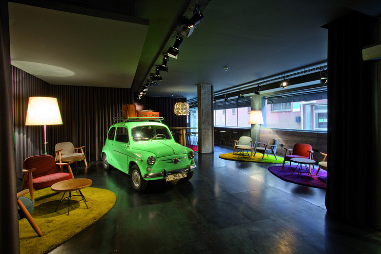 En el lobby hemos querido jugar con objetos icónicos de la época: El Seat 600, una peseta gigante utilizada como mesa y un panel con enormes llaveros magnéticos… como en las pensiones de entonces...
