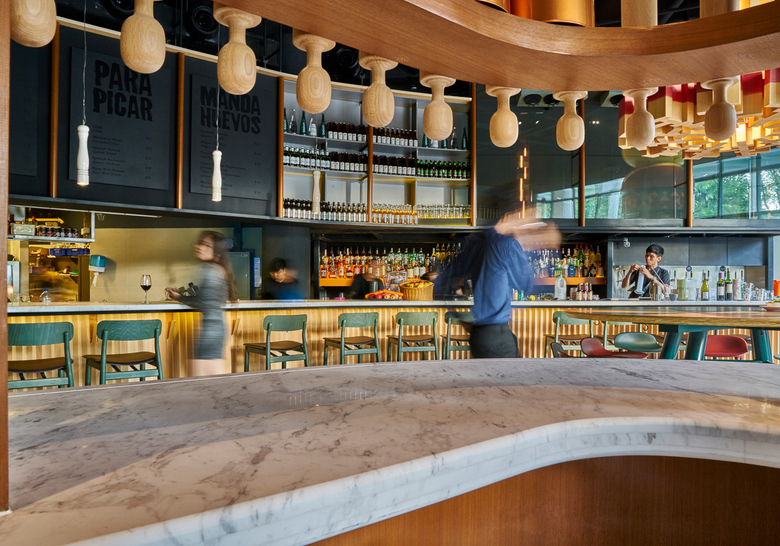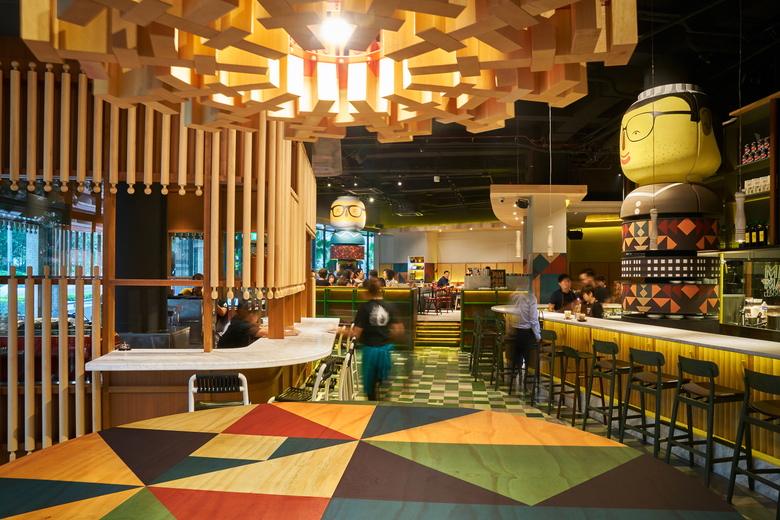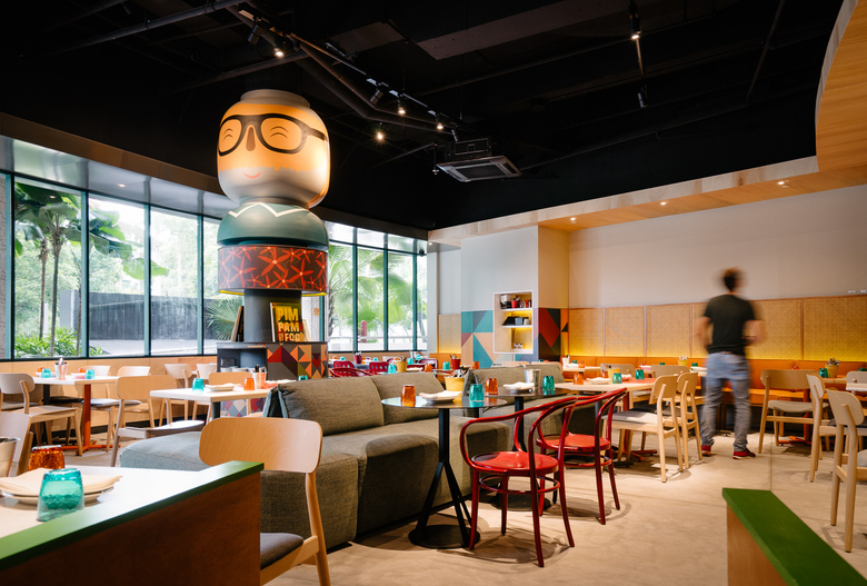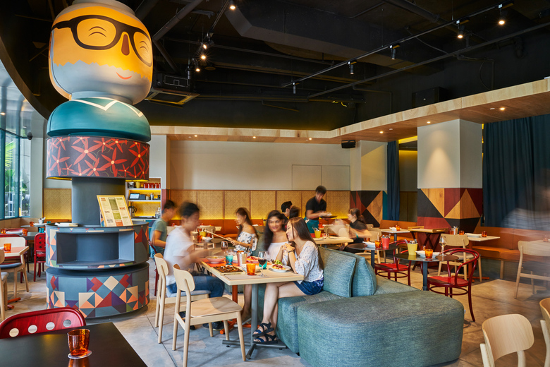The restaurant looks inviting featuring the Catalonian folklore with elements such as the papier-mâché giants or Capgrossos; a lamp that features Els Castellers: a human tower, typical in Catalan celebrations, and furniture specially designed by Lagranja.