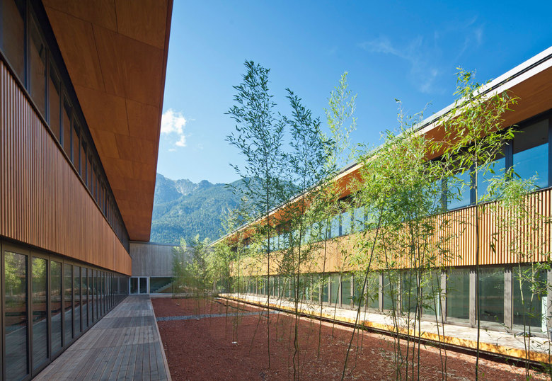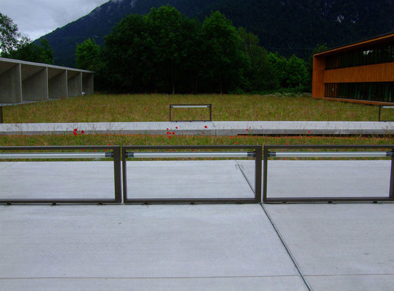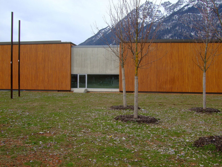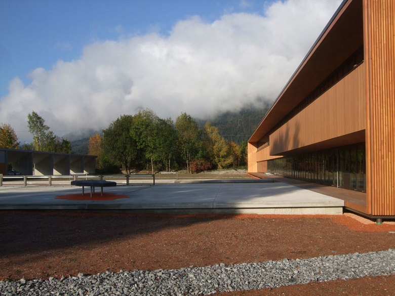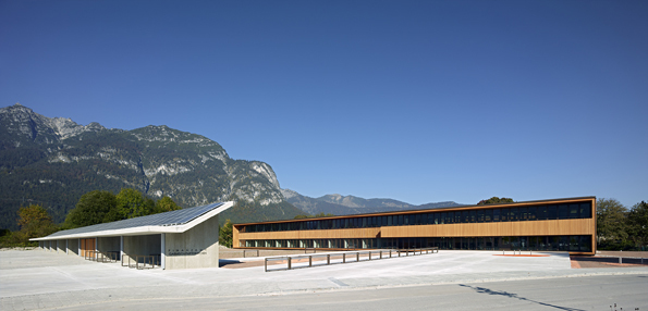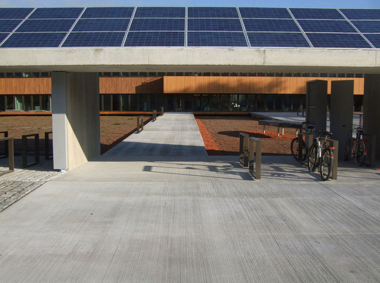 Der Eingangsbereich wurde mit einer großzügigen Platte aus Ortbeton mit Besenstrich versehen. Alle Ausstattungsgegenstände wie Lampen, Radlbügel, Poller und Fahnenmasten sind in einer einheitlichen, eigenständigen Gestaltsprache entworfen.