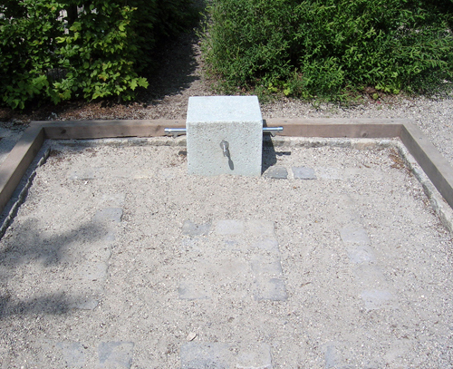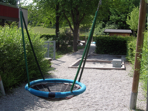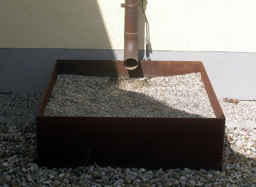 Die Spielgeräte liegen randlich zu der zentralen Spielwiese und den labyrithartigen Heckenstrukturen aus Hainbuche und Weide. Das Dachwasser der Gebäude wird in großen Töpfen aus rostendem Stahlblech aufgefangen und dann versickert.
