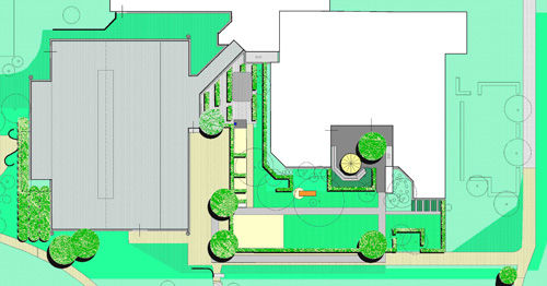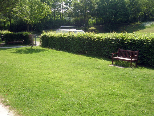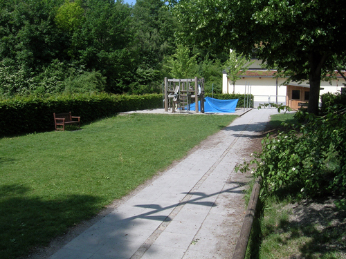 Durch den Anbau einer Ballsporthalle wurde die Neuanlage des Außenbereiches für den Kindergarten im Freizeitheim notwendig. Die bestehenden Freiräume um das Gebäude sind mit geschnittenen Hainbuchenhecken gegliedert und abgegrenzt; aus diesem Grund waren diese Hecken auch bei der Neuanlage ein wichtiges Element.