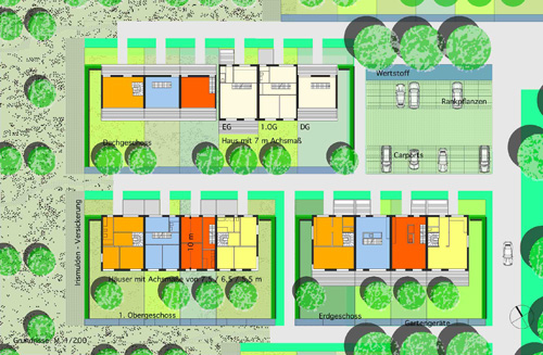 Die Obstbäume ziehen sich auch in die Siedlung hinein, so dass jeder Hausgarten einen Obstbaum besitzt und insgesamt der Eindruck des Wohnens in einer Obstwiese entsteht.