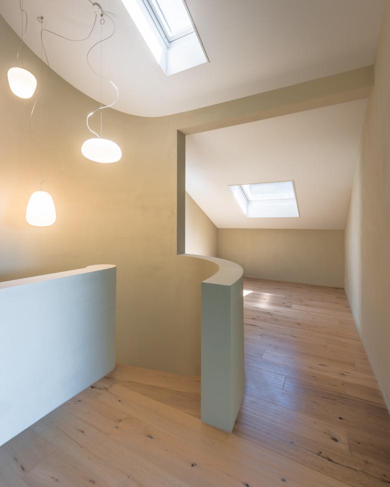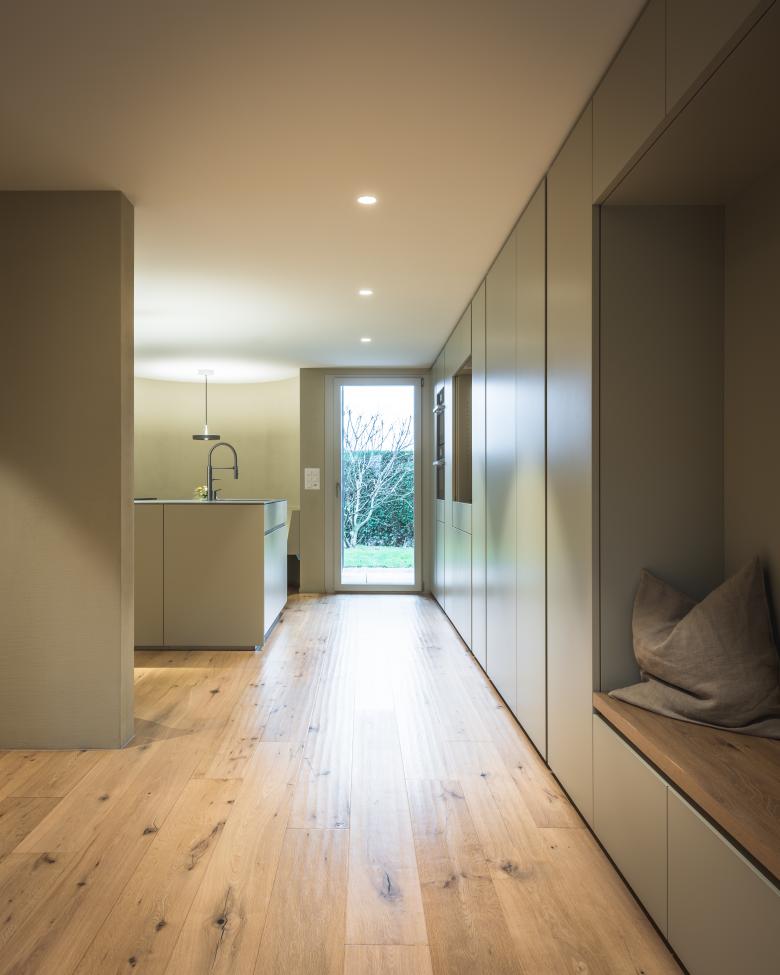 Im Innern entstanden durch wenige, gezielte Grundrissanpassungen fliessende, grosszügig erscheinende Räume. Ein Höhepunkt im Erdgeschosses des Hauses ist der Betonbank im Wohnraum und die Stahlverkleidung des Cheminées. Die privaten Räume im Obergeschoss dienen zum Arbeiten, Schlafen, Spielen und Erholen. Der bis anhin ungenutzte Balkon im Obergschoss wird zum Aussenruheraum der Sauna, die geschickt ins Bad integriert ist. Das eher kleine Kinderzimmer wird erweitert durch eine private Aussenspielfläche auf dem zweiten Balkon.
