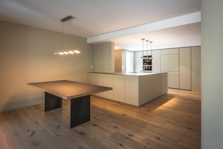 Die massgeschneiderte Küche und extra entworfenen Möbel ergänzen das Haus stilvoll zu einem Ganzen.