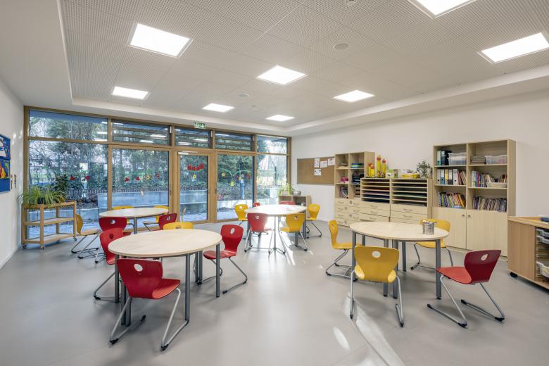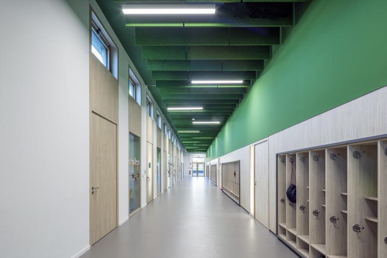 Das Gebäude ist einfach gegliedert. Zum Pausenhof orientieren sich die kleineren multifunktionalen Räume, die Verwaltung, die Technik und die Nebenräume. Im Süden mit vorgelagerter Terrasse sind die großen Gruppenräume organisiert. In der mittleren Erschließungsachse sind zusätzlich die Garderobenbereiche als Einbaumöbel angeordnet.