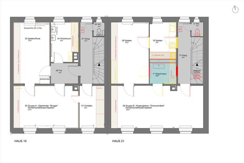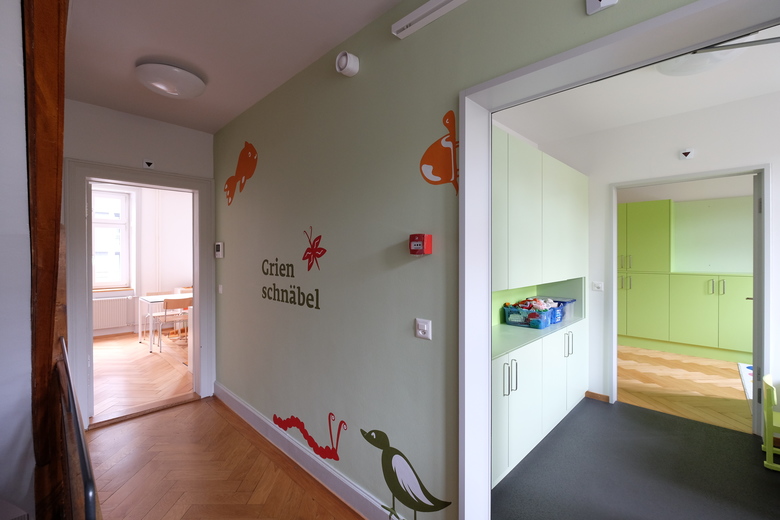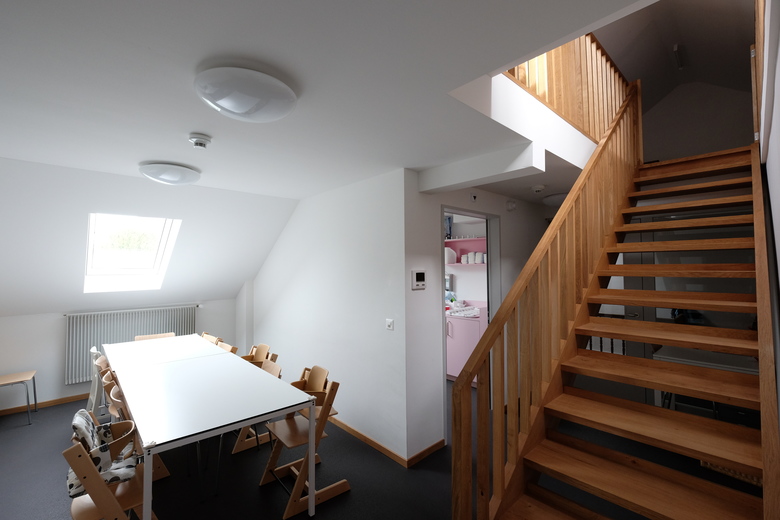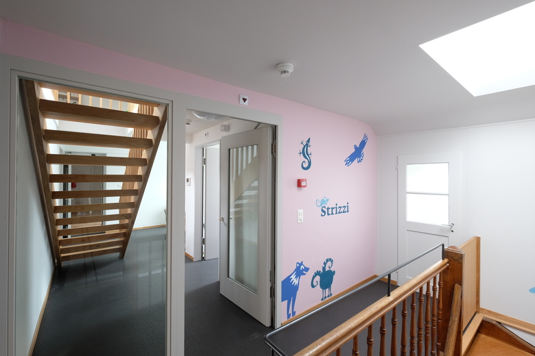 _ Erweiterung der Kita um die Nachbarliegenschaft und entsprechender räumlicher Neuorganisation: Neupositionierung Waschraum, Zusammenlegung kleiner Zimmer zu einem grossen Spielraum pro Gruppe.