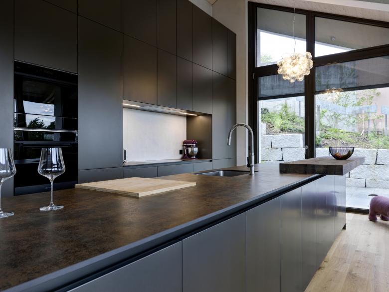 Materialwahl: Bei der Materialwahl wurde auf ausgewählte und langlebige Materialien gesetzt. Für die Fassade des Pavillons wurde weiss eingefärbter Sichtbeton gewählt, der modern und zeitlos wirkt. Der Bauherr war gleichzeitig der Baumeister, alles wurde vor Ort perfekt in höchster Qualität geschalt und betoniert. Im Obergeschoss bestehen alle Aussen- und Innenwände sowie auch die Betonrippen aus Sichtbeton mit Innendämmung, das bestehende Erdgeschoss wurde bereits im klassischen Zweischalenmauerwerk gebaut. Die Fenster bestehen aus hochwertigem Holzmetall. Das Dach ist als Satteldach mit Mineralwollisolierung ausgeführt und mit Natursteinschiefer eingedeckt, während die Untersicht mit sägerohem Fichtentannen verkleidet ist. Im ganzen Haus wurde Eichenparkett im Format Landshausdielen verlegt. Die Kücheneinrichtung und Garderoben sind vom italienischen Hersteller Ernestomeda.