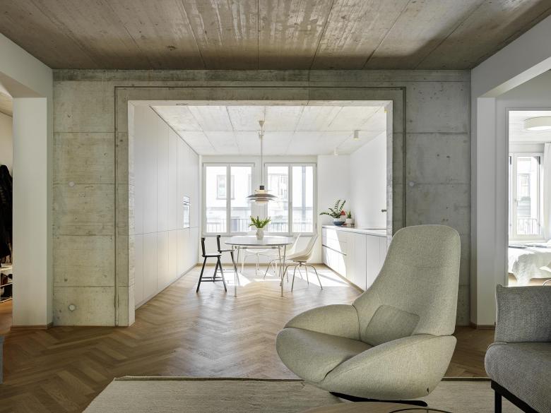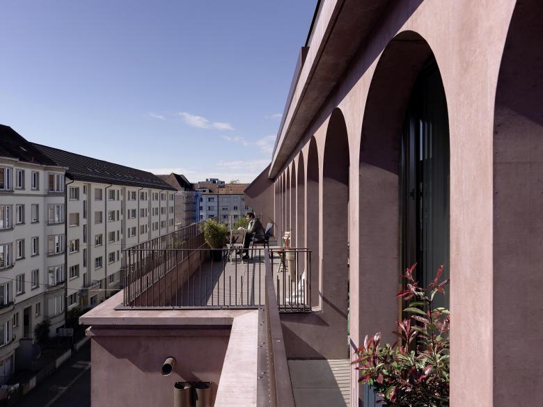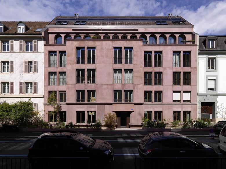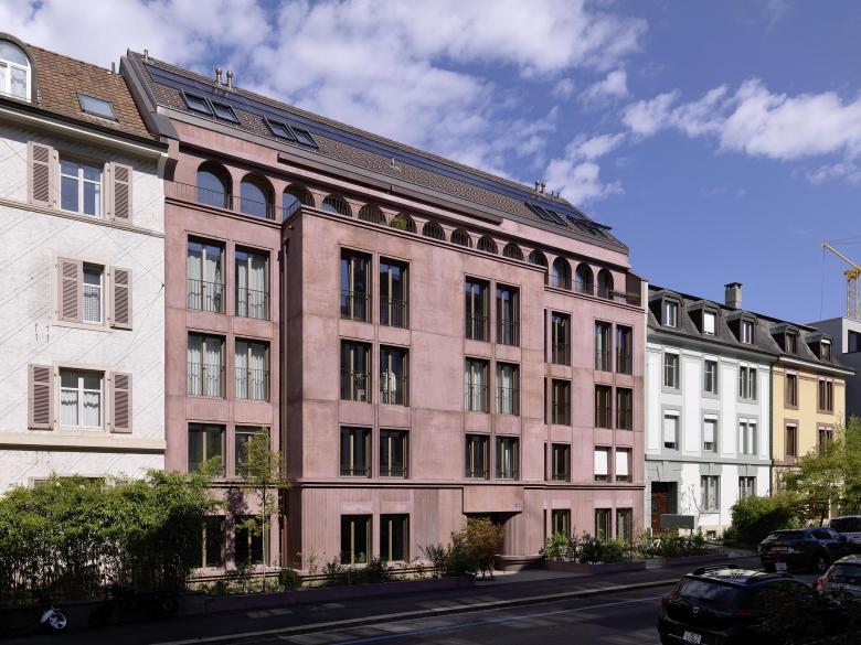 Die rötlich eingefärbte Fassade mit mittig angelegtem Risalit erscheint optisch kürzer und fügt sich harmonisch in den Strassenzug ein. Traditionelle Elemente wie Lisenen und Profile - die im Strassenbild zu finden sind - werden neu interpretiert und verleihen der Fassade Struktur und Tiefe. Zusammen mit den bogenförmigen Fenstern im Attikageschoss sowie einem Satteldach präsentiert sich das Gebäude in seinem Gesamtauftritt als zugleich klassischer und doch zeitgemässer Bau.