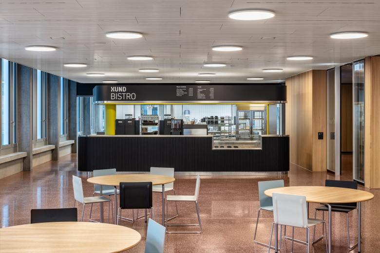 Auf die urbane Dichte des Gebäudeensembles antwortet im Inneren des Bildungszentrums ein grosszügiges Atrium. Das Foyer mit seinen Lerninseln ist Lichthof und Herz des Hauses. Beim Durchschreiten zeigt sich hier das einfach organisierte Innenleben des Gebäudes: Direkt anschliessend finden sich Cafeteria, Mediothek und Rezeption.