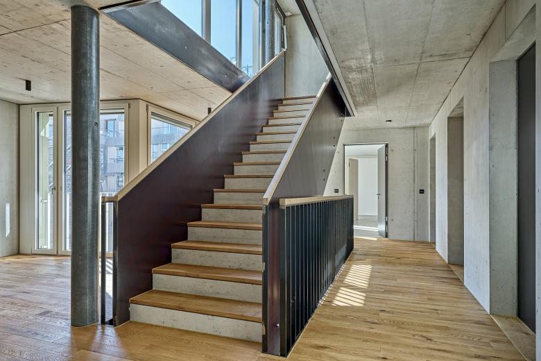 Das 5-geschossige Eckgebäude mit Attikageschoss bildet den südlichen Abschluss des neuen Quartierplatzes. Die 22 Zweizimmer- und acht Dreizimmerwohnungen sind für Ein- und Zweipersonenhaushalte bestimmt. Ergänzt wird das Wohnungsangebot durch ein Gästeappartement, eine «Waschbar», eine Dienstleistungsfläche im Erdgeschoss und ebenerdige Veloabstellräume. Hofseitig sind auf allen Vollgeschossen nach Süden ausgerichtete Gemeinschaftsbalkone direkt vom Treppenhaus zugänglich.
