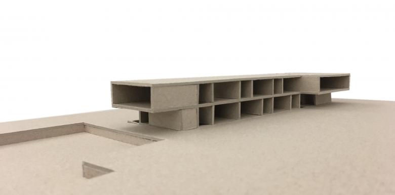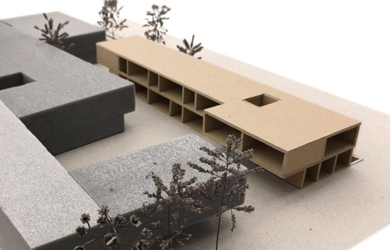 Durch die Auskragungen im Obergeschoß kann der bauliche Fußabdruck im Erdgeschoß reduziert werden zugunsten einer großzügigen Eingangssituation und einer erweiterten Pausenfläche. Die vorhanden tieferliegenden Freiräume im östlichen Bereich könnten weitestgehend erhalten bleiben.