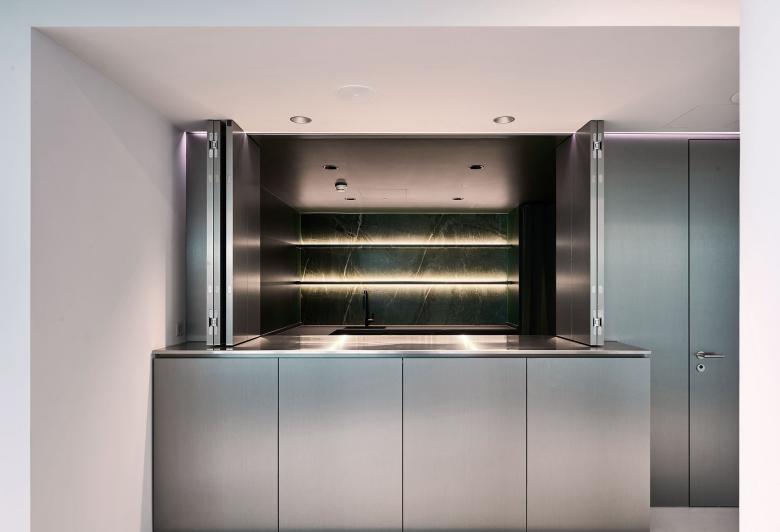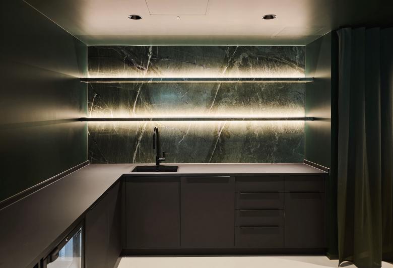 Um den Anforderungen der Investmentgesellschaft an Funktionalität, Ästhetik und Diskretion gerecht zu werden, unterteilt Mint Architecture die langgezogene Bürofläche in zwei Zonen: eine «private» Zone ausschliesslich für die Mitarbeitenden und eine «öffentliche» Zone für Kundenempfänge. Beide Bereiche sind um den zentralen Erschliessungskern angeordnet und durch mehrere Verbindungen miteinander vernetzt. Im privaten Bereich befindet sich die Arbeitsumgebung mit Open-Space-Arbeitsplätzen, Pausenraum und Fitnessstudio für die Mitarbeitenden. Die öffentlich zugängliche Zone umfasst unterschiedlich grosse Besprechungsräume und eine Bar für Meetings und Anlässe aller Art. Obwohl die beiden Zonen durch ein sicheres Zutrittssystem voneinander getrennt sind, bleiben sie dank Glastüren und Glaswänden von beiden Seiten einsehbar.