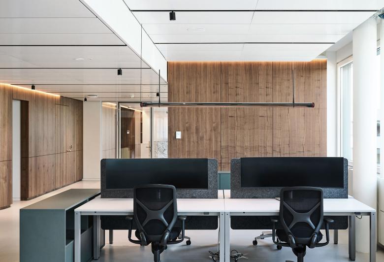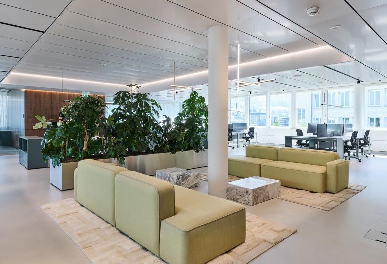 Für die private Zone entwirft und realisiert Mint Architecture eine grosszügige Arbeitswelt mit einer Kombination aus Open-Space-Arbeitsplätzen, Einzelbüros und Fokusräumen, die sich entlang der Fensterfronten erstrecken. An die offene Arbeitsplatzumgebung schliesst sich der Pausenraum mit einer aus Nussbaumholz furnierten Küche an. Eine bequeme textile Bestuhlung, eine lange massgefertigte Sitzbank, gezielte Lichtquellen und Kunstwerke laden hier zur Kaffee- und Mittagspause ein. Ein Fitnessraum mit Dusche und Umkleide bietet zudem die Möglichkeit für Workouts – ob morgens, abends oder auch zwischendurch.