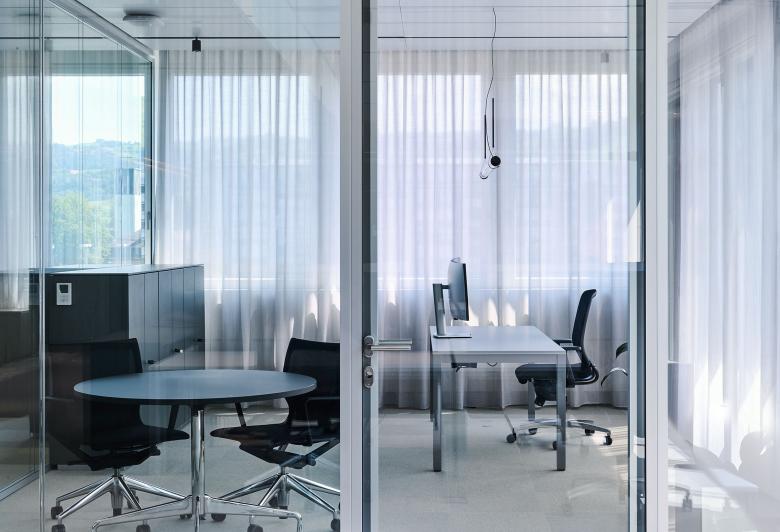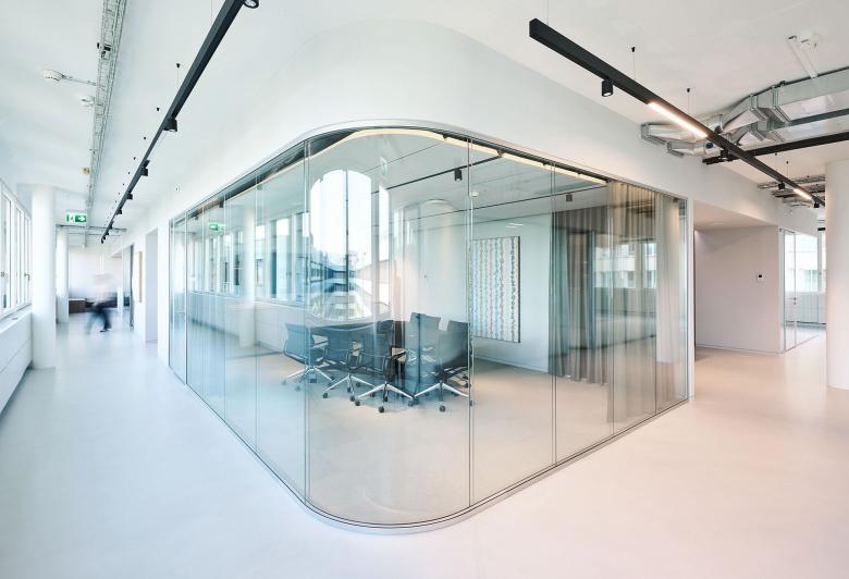 In der öffentlichen Zone befinden sich unterschiedlich grosse Meetingräume, die mit modernster Konferenz- und Videotechnik ausgestattet sind. Je nach Art und Grösse des Meetings stehen Räume mit langem, rundem oder einem kleineren Besprechungstisch und unterschiedlicher Bestuhlung zur Verfügung. Bodenlange Vorhänge schützen vor Lichteinfall und Einblicken, während der Boardroom zusätzlich über Glastrennwände verfügt, die von transparent auf transluzent geschaltet werden können und maximale Diskretion bieten. Eine Cateringbar, die hinter einer Metallfaltwand verborgen ist, ermöglicht die Bewirtung von Gästen während Meetings sowie bei Anlässen und Events.