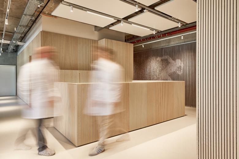 Diese Wegeführung wird durch raumbildende Einbauten und Elemente unterstützt, die aus der linearen Struktur und den schallabsorbierenden Wandverkleidungen aus Birkenholz hervortreten. Ihre skulpturale Formgebung setzt ebenso visuelle Akzente wie die akustisch wirksamen Deckensegel mit integrierten Langfeldleuchten und die maßgefertigten Garderobenschränke. Gleichzeitig sorgen sie für eine angenehme und diskrete Raumakustik in einem vertraulichen Umfeld.