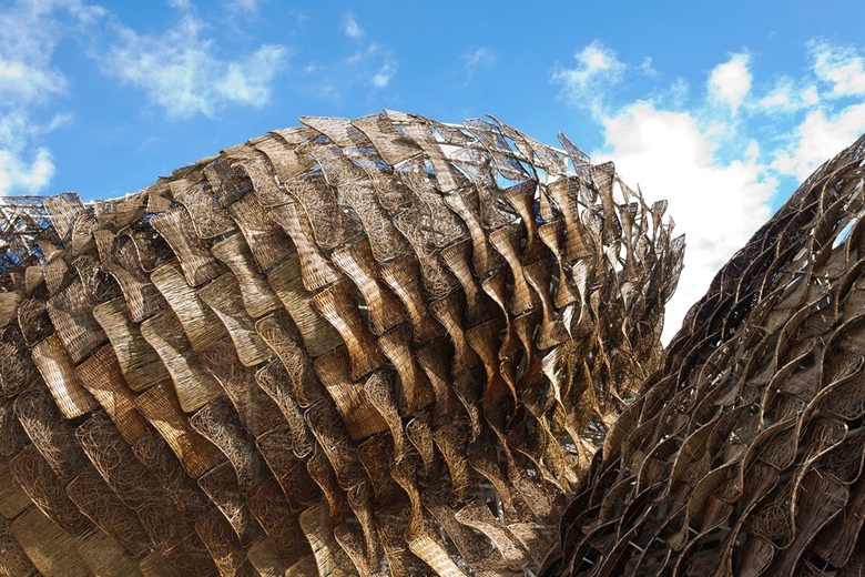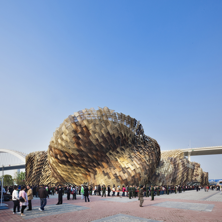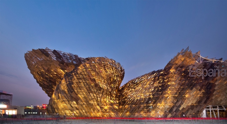 The Spanish Pavilion for the 2010 World Expo of Shanghai sought to reflflect upon the Spanish climate, as well as to recover the extraordinary craft of wickerwork in order to bring it back to life and to reinvent it as a new construction technique. This building sought to play with the incredible potential of wickerwork. Furthermore, it sought to introduce wicker as a sustainable and viable material concept that would remain present throughout the building. Basketry techniques, handcrafts with natural fifibers, are a global tradition shared by cultures of all ages. Even though they vary from region to region, they occur in similar ways East and West. In this sense, the material choice for the pavilion attempted to bridge between two cultures, the Spanish (visiting) and the Chinese (the host). The Spanish Pavilion has a usable area of 7,500m2. Aside from the spaces destined to hold the main exhibits, the pavilion is fitted out to host offificial receptions with an auditorium, a conference room, a press room, and support area.