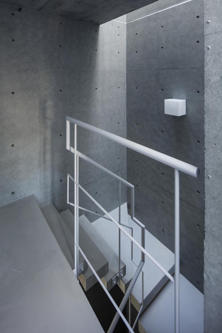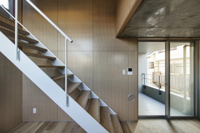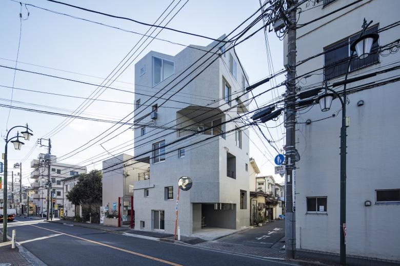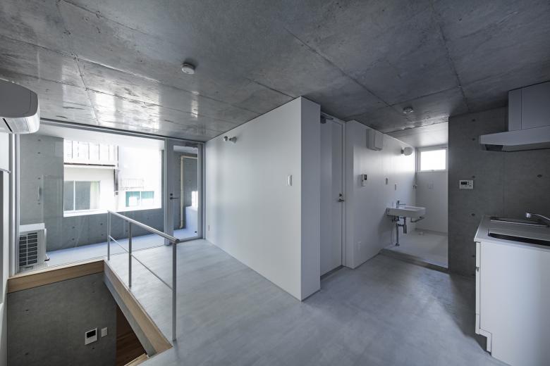 この建物は7戸の単身者用賃貸住宅からなるアパートメントである。狭小な敷地に地下を含めた6層に7つの住戸を積層している。階高を2,500mmに抑え、最小限の平面による階段室のコアを中央に配し、2.5m内外の細長いボリュームが外形を敷地いっぱいに沿わせながらコアを囲んでいる。その中で各住戸はL字型の平面、あるいはそれがズレて重なるメゾネット型となり、基本的には端部にテラス、もう一方の端部を水廻りとしている。