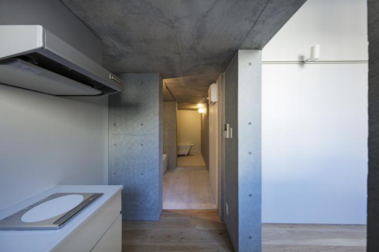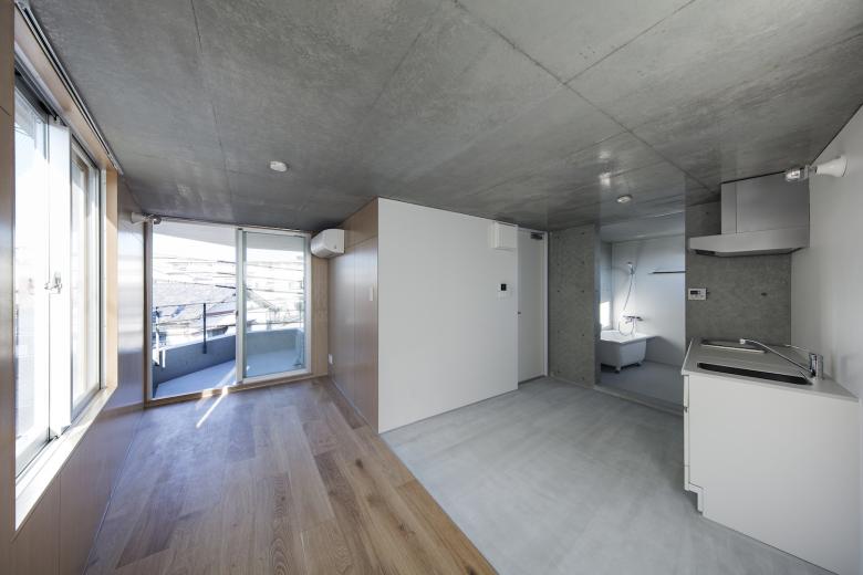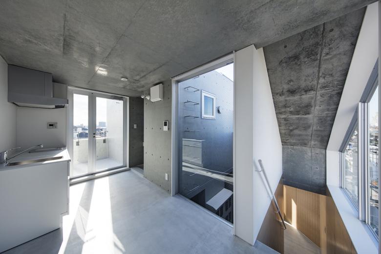 このような構成は一部を除いた各住戸において全方位に対して窓を穿つことを可能にし、裏をつくらずに住戸を隣接する空所に余すとこなく対峙させようとするものである。また各住戸は幅が狭いので、いわば全てがペリメーターゾーンであり、窓際であるともいえる。どうしたって身体と窓の距離が近くなるので、体感的には建物の外形を超えて空所に晒されている、あるいは空所を住戸内に抱え込んでいるかのようである。
