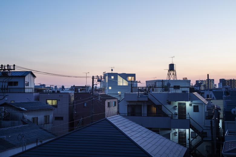 この建物の敷地周辺は1種住居地域や準工業地域といった用途地域だが、狭隘な敷地や道路が多く道路斜線や日影規制によって建物の高さは低層程度に抑えられている。一方で集団規定の副産物として、上空では物的に何によっても占有されることのない「空所」が自ずと残されることとなる。地上では建物が建ったり、解体されたりして都市が更新されていくが、上空の空所は過去から現在まで継続して、そして未来に渡ってもただ空いていることが期待される。地上で人や建物が占拠、占有する場が「図」になるとすれば、その一方で何ものにも占有されることのない空所は都市の「地」として捉えられ、都市のダイナミズムから離れた静的な拠り所として考えることができるように思う。