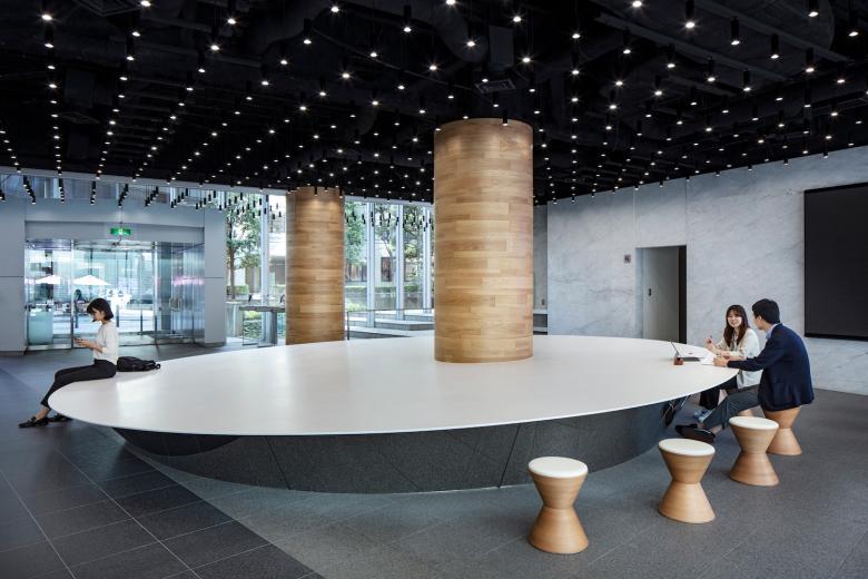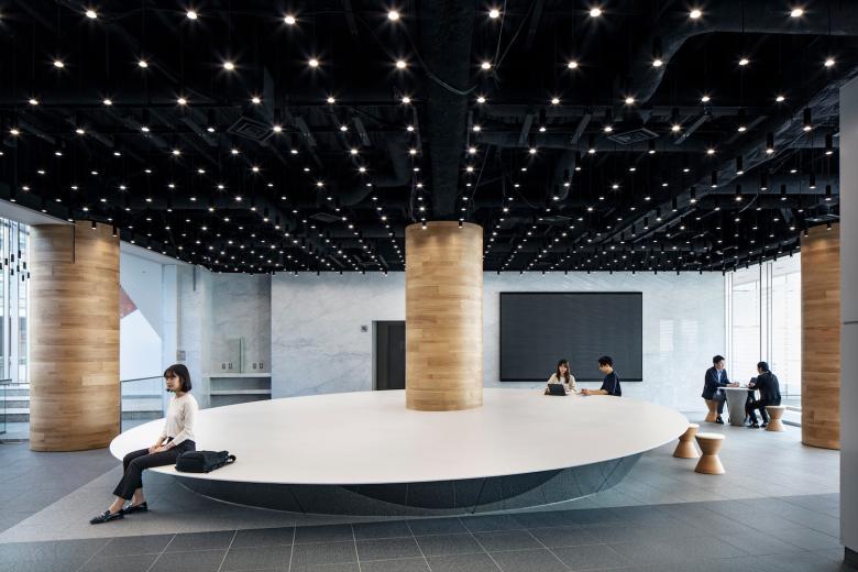 渋谷駅南口に90年代に建てられた14階建のビルのエントランスは、東の接道と西の線路敷に対してガラスのファサードで面していて、東の2層分の吹き抜けはオーセンティックな本社ビルの有り様だ。ただし東側は高層ビルが建て込んでいるので午前中は日当たりが悪く、太陽が登ると外は明るいけれど内は暗い。夕方は線路敷越しに低くて強い西日が差し込んできて、吹き抜けが暗い。時間帯によって光溜まりのコントラストがとても強く、どの時間帯でもなんだか見通しの悪い室内環境であった。今回の改修に際して、石張りの床・壁には触れていない。従前の明度のコ ントラストを無くし、フラットな光環境とすることを意図した。吹き抜けを横断して800灯のペンダントライト@500をCH3100の高さに吊り下げ、床面を均一に照らしている。真ん中の柱には少し傾いた直径7mの白い人造大理石の円盤が貫入し、レフ板の様に全体に光を拡散する。この円盤は待合のベ ンチにもなるし、打合せテーブルにもなる。