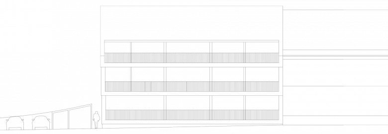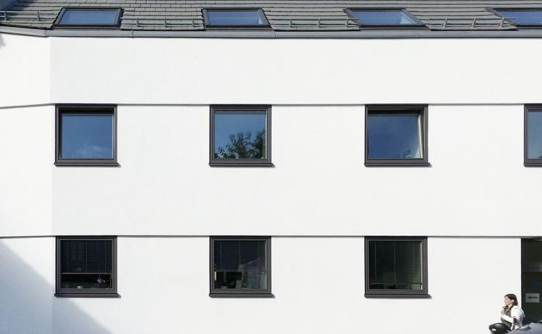 Auf einem schwierigen, dreieckig geschnittenen Grundstück im Großraum Frankfurt steht dieses Mehrfamilienhaus, dass verschiedene Wohnungsgrößen kompakt organisiert. Die Fassade nimmt die charakteristischen Auskragungen der umliegenden Fachwerkbebauung auf. Gleichzeitig spart das Gebäude mit sonstigen Details und präsentiert sich als moderner Solitär.