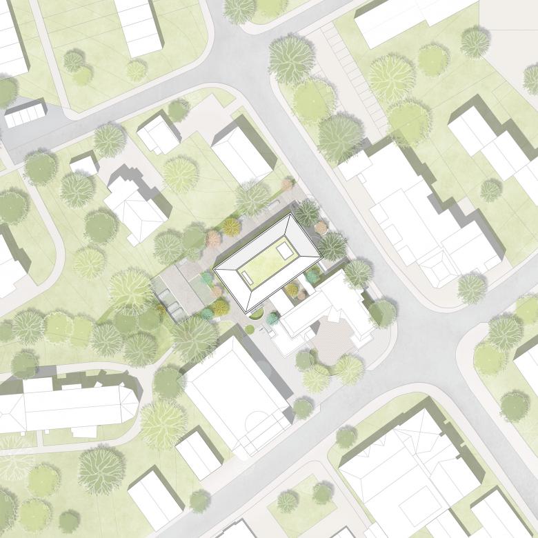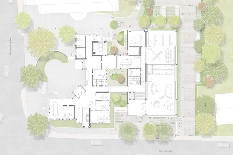 Der Bücherei-Neubau ist als zentraler Treffpunkt für die Gemeinde Lensahn konzipiert. Mit seinem klaren und kompakten Baukörper fügt sich der zweigeschossige Neubau selbstverständlich in die Umgebung ein. Form und Farbigkeit nehmen Anleihen am alten Rathaus und der benachbarten Kirche, womit sich das Gebäudevolumen harmonisch in die Umgebung einfügt. Entlang der Sundstraße wird mittels Rücksprung ein kleiner Vorplatz definiert und eine Adressbildung unterstützt. Der große Saal der Bücherei öffnet sich mit einladenden Glasflächen zu diesem Vorplatz, durchzieht das gesamte Gebäude und schließt an den rückwärtigen Kirchgarten an.