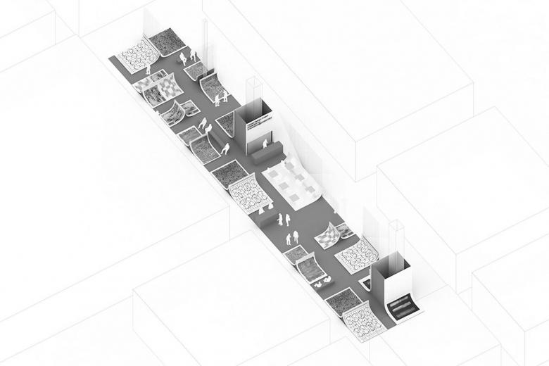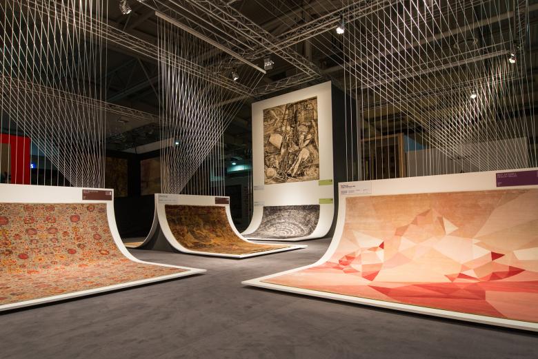 Für die Displays der handgeknüpften Teppiche wird das Thema des Webens und des Webstuhls herangezogen und mit elegant aufgebogenen Flächen kombiniert. Jeder Teppich kann so gut aus der Ferne und von nahem begutachtet werden. An passenden Stellen verwandeln sich die gebogenen Flächen in Sitzgelegenheiten oder Schautafeln.