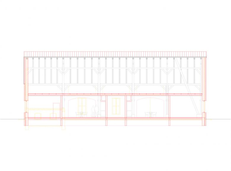 Der Umbau einer bestehenden Scheune zu zwei Ferienwohnungen hat vor allem das Ziel, den Wohnraum durch die alten Scheunentore hindurch in die umliegende Landschaft hinein zu öffnen. Dazu werden im Inneren alle Funktions- und Schlafräume als kompakte Streifen organisiert, zwischen denen sich die Wohn-Essbereiche öffnen. Der mittlere Schlafraum kann nach Bedarf der einen oder anderen Wohnung zu geschlagen werden. Die Kubatur der Scheune bleibt dabei unverändert und auch der ortstypische Klinker der Fassade kommt wieder zum Einsatz.