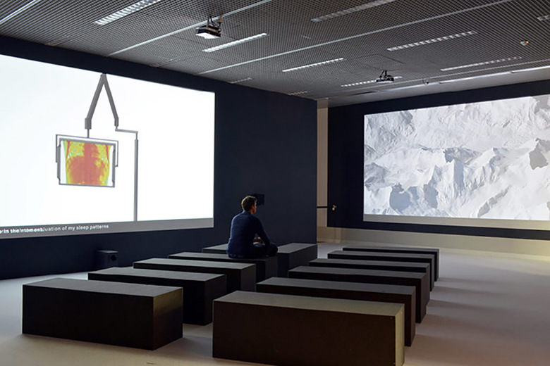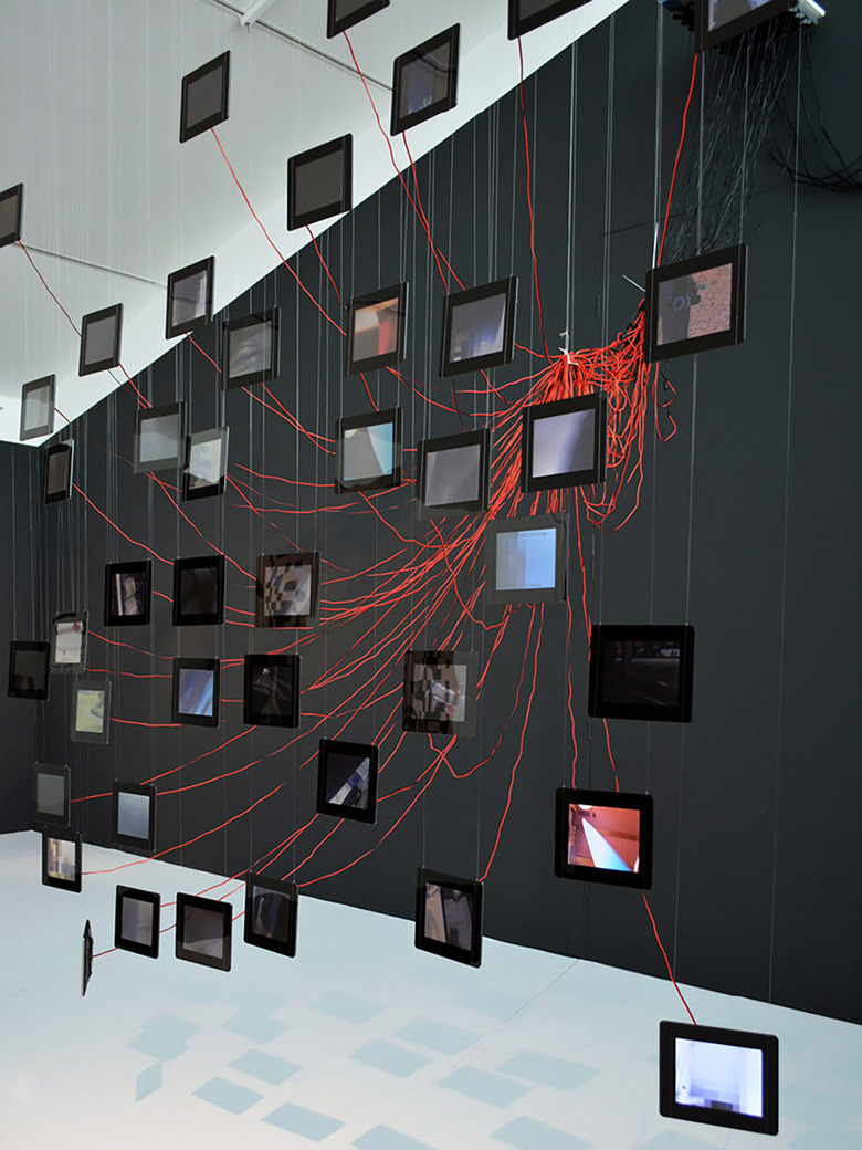 Zwischen digitaler Überflutung und analoger Beschränkungen entsteht ein Spannungsfeld, welches die Szenografie inszenieren möchte. Die Ausstellung ist als ein abstraktes Schachbrett in schwarz-weiss konzipiert, auf dem der Besucher sich frei bewegen darf. Als Spiegelbild des endlosen digitalen Netzes wird auf eine Gliederung des Raumes und eine Hierarchisierung der Themen verzichtet. Stellwände als Extrusion des Rasters sind etwas willkürlich platziert und dienen primär der Präsentation der Kunstwerke.