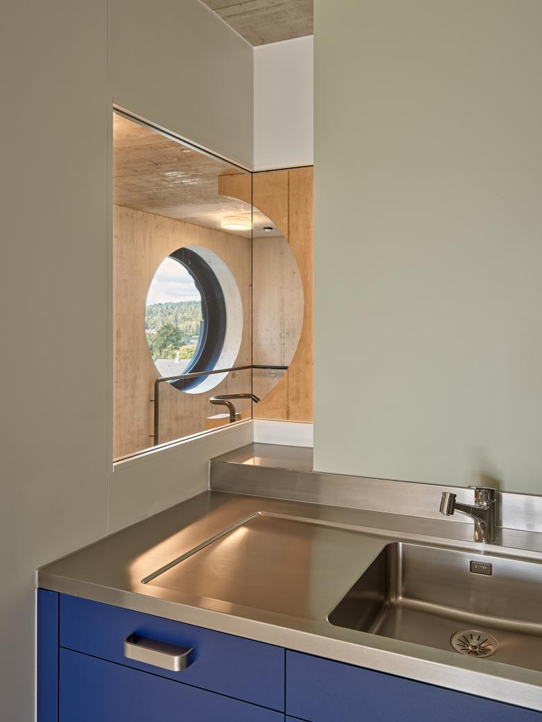 Der architektonische Ausdruck des neuen Wohngebäudes wird im Wesentlichen durch die differenziert gestaltete Fassadenabwicklung geprägt. Der massive Betonsockel verweist auf die mehrheitlich gemeinschaftlichen, zum Teil öffentlichen Nutzungen im Eingangsgeschoss und verleiht dem Gebäude eine gewisse Robustheit. In den oberen Wohngeschossen wird mit der hochwertigen hinterlüfteten Fassade der Lage des Hauses am Wald- und Stadtrand Rechnung getragen.