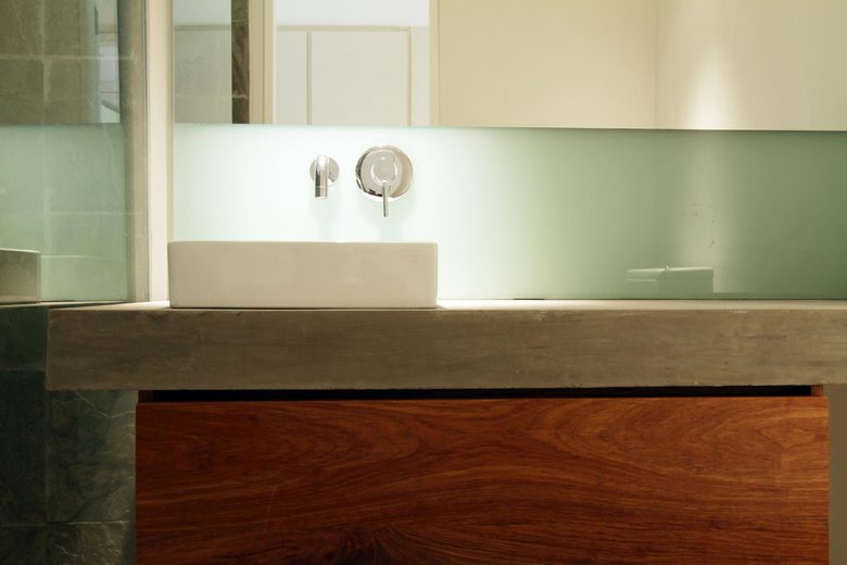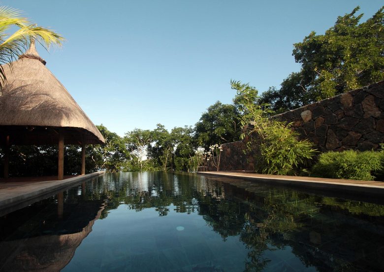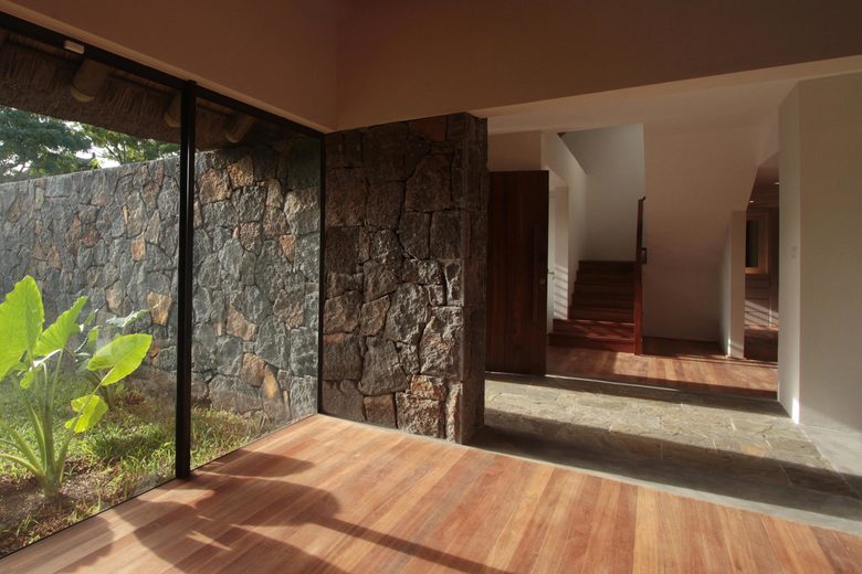 The tropical contemporary design of the house and pool was oriented to utilise natural ventilation and shading to create a comfortable environment to reduce the requirements for mechanical ventilation systems in the tropical climate. The construction of concrete, wood, stone and thatch roof nestles perfectly among the existing natural mangrove at the edge of the bay.
