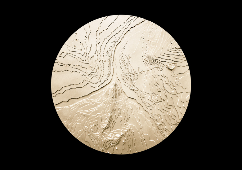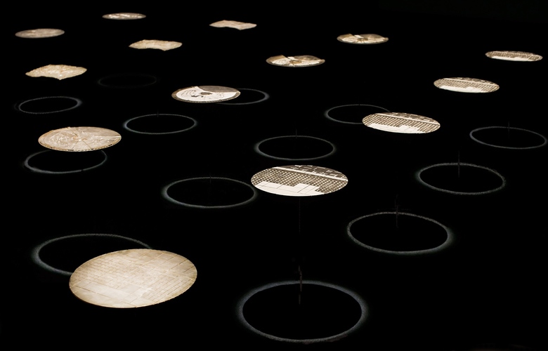 Since the five cities are fictional and surreal, to strengthen this concept, the display table and the lighting are specially designed. To decrease the exhibit's 'gravity', the base of the table is covered by felt. Above the felt, a 2cm steel pipe works as leg to support the whole table. In the ceiling, a customized spotlight is used to illuminate the model and generate a halo on the floor. These details together make the models looks like 'floating' in the air.