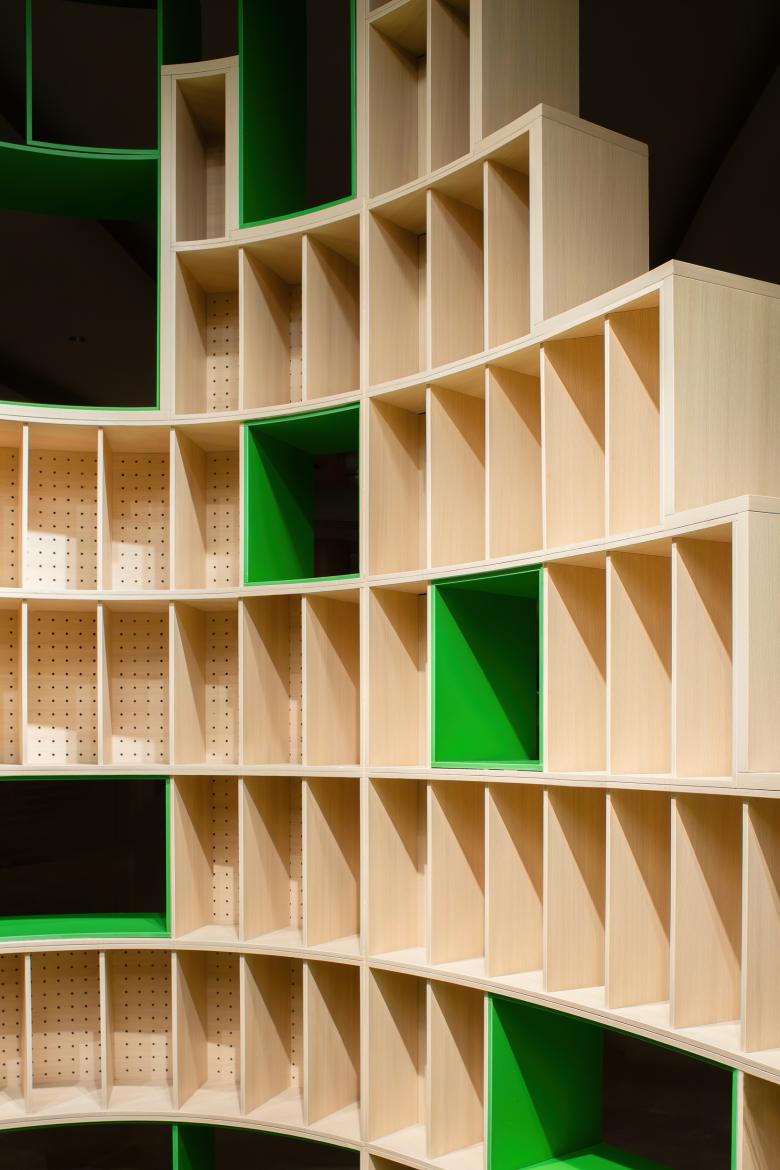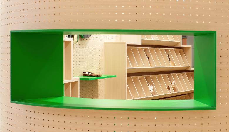 The material selection includes white oak, green PVC flooring and green stainless steel to match the brands natural and lively tone. The electrical cables are concealed within the steel tubes to power the lights. Due to operational requirements, a magnetic track system is used to meet the flexible lighting demands.