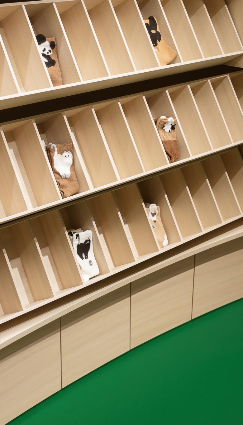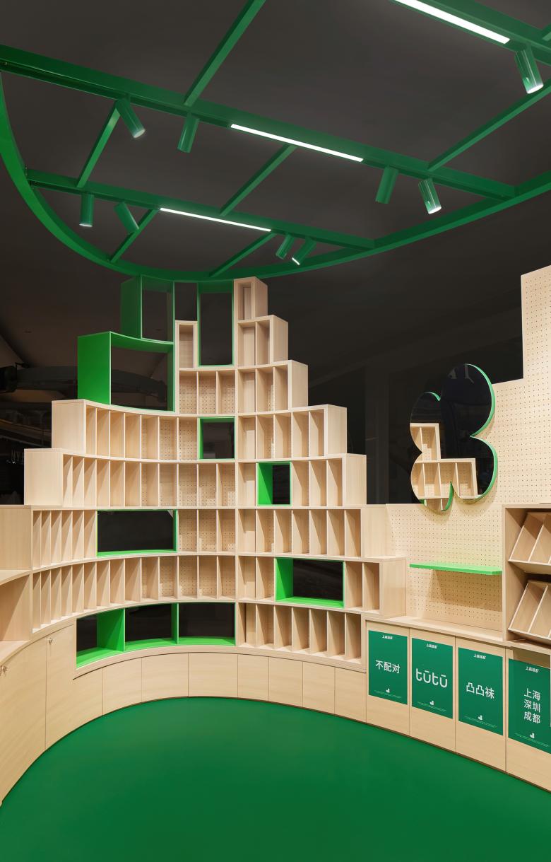The team first sorted out different sizes and types of SKUs, and later stacked them around the island to simulate the silhouette of vegetation. The trellis was translated as track light, which stands on top of the island. The brand's logo, the green sock flower, is enlarged several times to get attention of passers-by, while the sock’s back is a mirror.