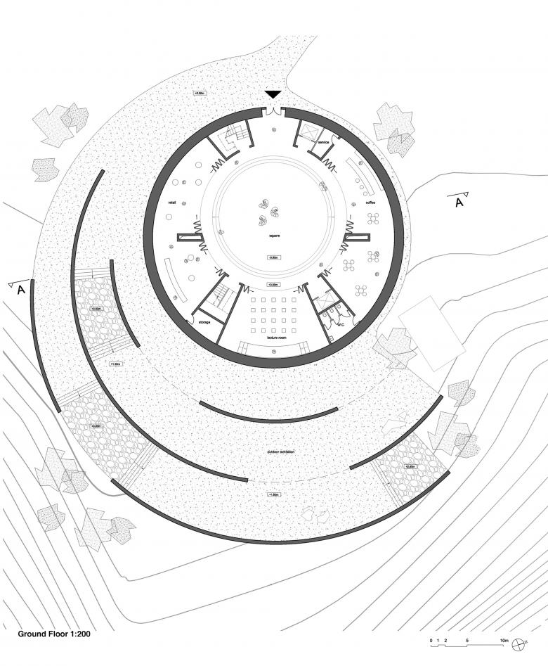 The design retains the original façade, removes the damaged timber structure inside and redesigns the inner courtyard into an eccentric circle. The depth of the new Tulou various, which is easy to meet the different needs of the art and cultural space. A number of curved new rammed earth walls, spread around the outer wall of the building, form the outdoor exhibition area. We kept the original floor height of Tulou, in order to retain its intimate scale.