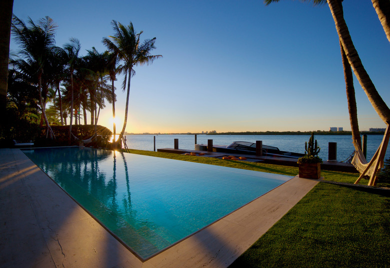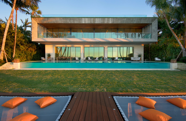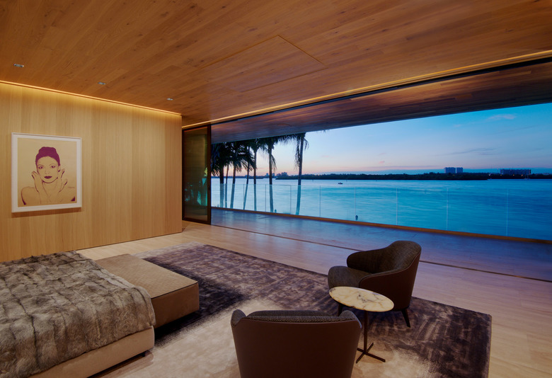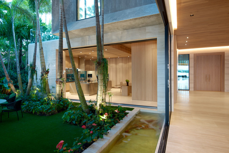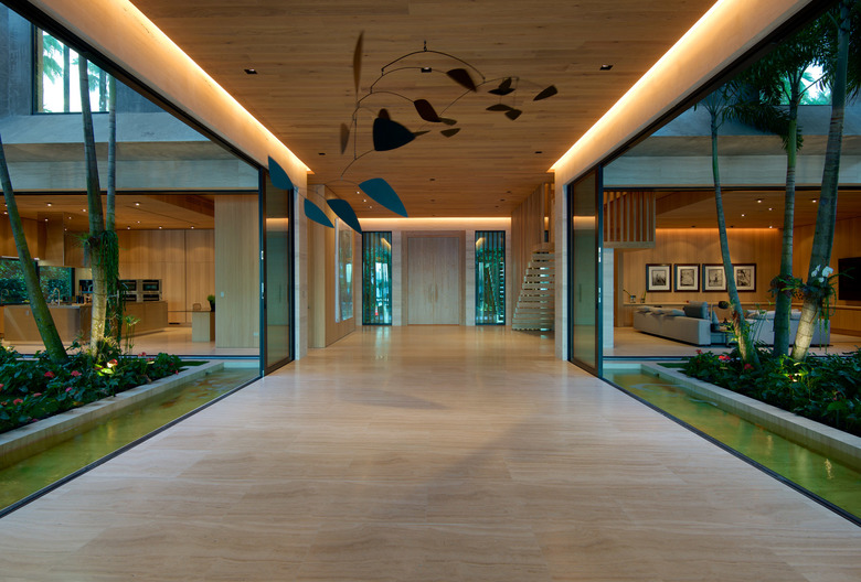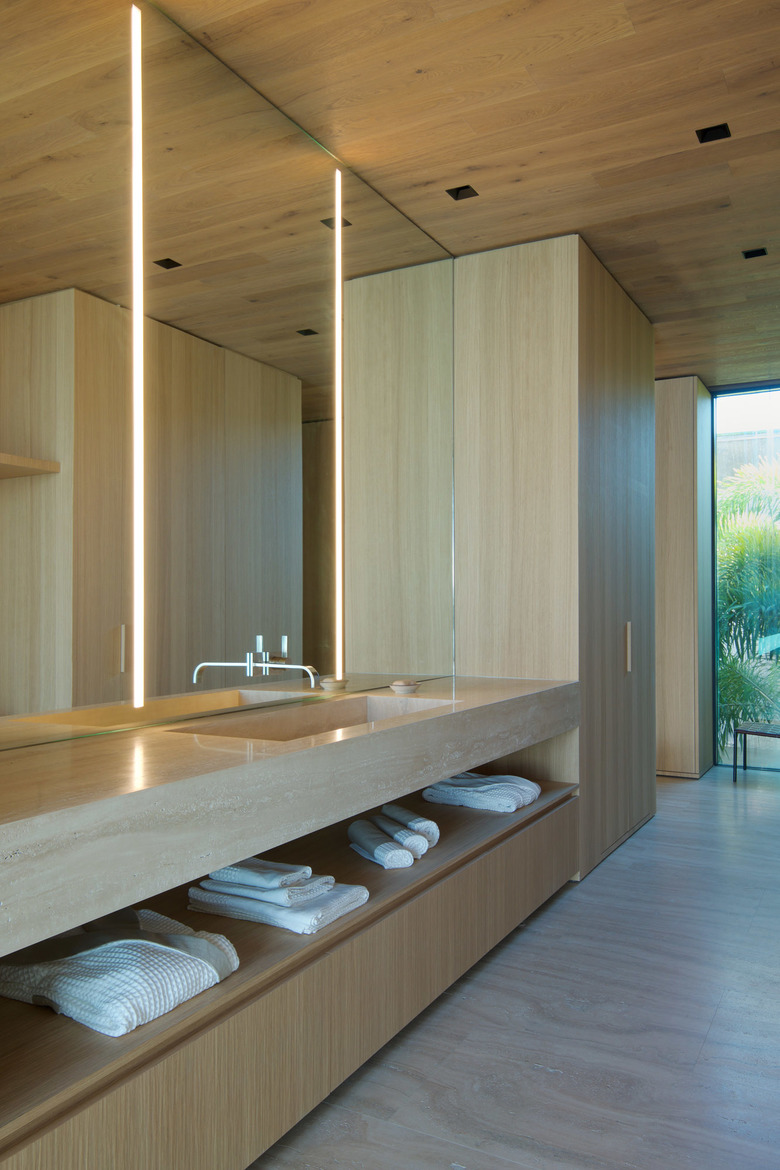 From the arrival in the car court with concealed stone garage doors to the main entry flanked by travertine reflecting pools, through the interior of the house, a continuity of material is maintained. This reinforces interplay with the landscape where interior and exterior become indistinguishable. The living, dining, entertainment, and service areas have immediate connections to interior courtyards through sliding glass panels that disappear into travertine clad walls, maintaining constant reference and visibility to the bay. The covered exterior deck and pool are also finished in travertine, maintaining a fluid connection that culminates with a glass-walled pool, creating a sublime interplay with the bay.